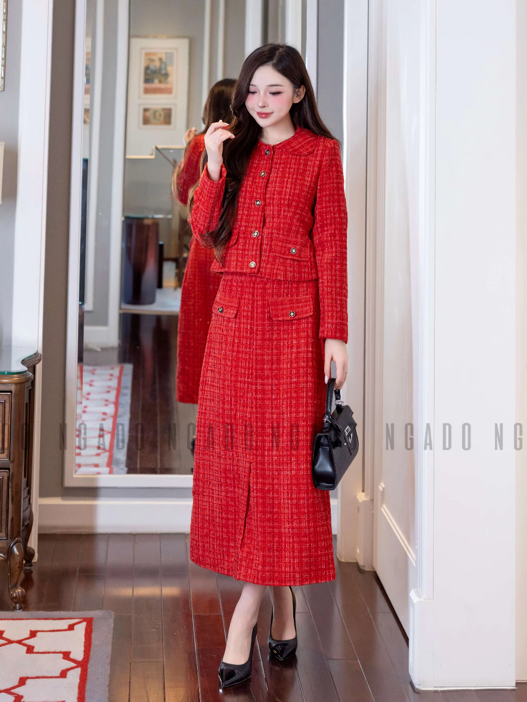 ✨Set áo váy tweed đỏ NGADO , set áo kèm chân váy dáng dài