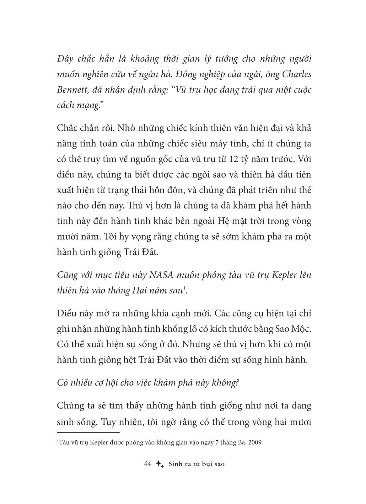 Những điều huyền bí ẩn giấu trong vũ trụ bao la, nằm ẩn sau cuộc đời của những con người đã cống hiến hết m.ình cho thế giới luôn là một câu hỏi lớn chưa có lời giải đáp. “Sinh ra từ bụi sao” là quyển sách tập hợp những cuộc đối thoại giữa tác giả với các nhà khoa học lừng danh - những người mà các phát kiến của họ đã góp phần định hình nên thế giới - mang đến đáp án mà ta hằng trăn trở, giúp ta lý giải được sự tồn tại của bản thân và hiểu thêm về cuộc đời của các nhà khoa học giữa thế giới tự nhiên.