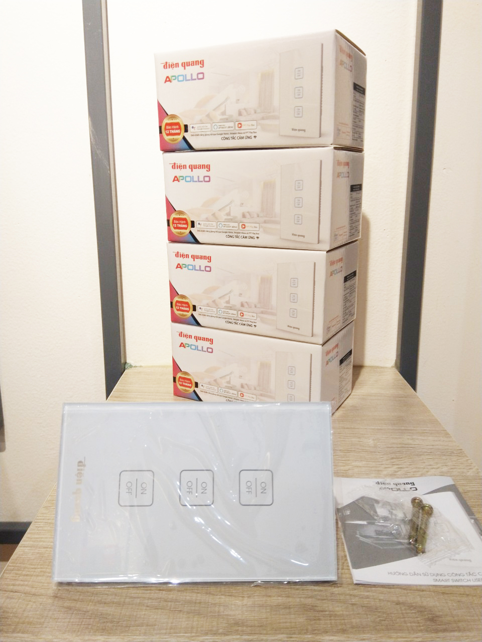 Công Tắc Cảm Ứng Điện Quang Apollo WiFi 3 nút, điều khiển từ xa ON/OFF