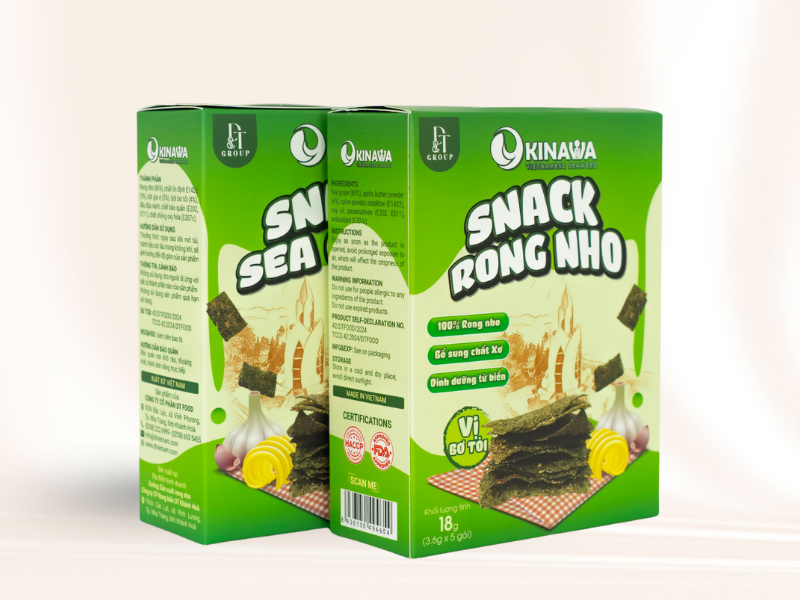 Mua tại Tiktok- Thành phần: Rong nho (85%), bột bơ tỏi (4%), bột gia vị, chất ổn định (E1422), dầu đậu nành, chất bảo quản (E202, E211), chất chống oxy hóa (E307c).