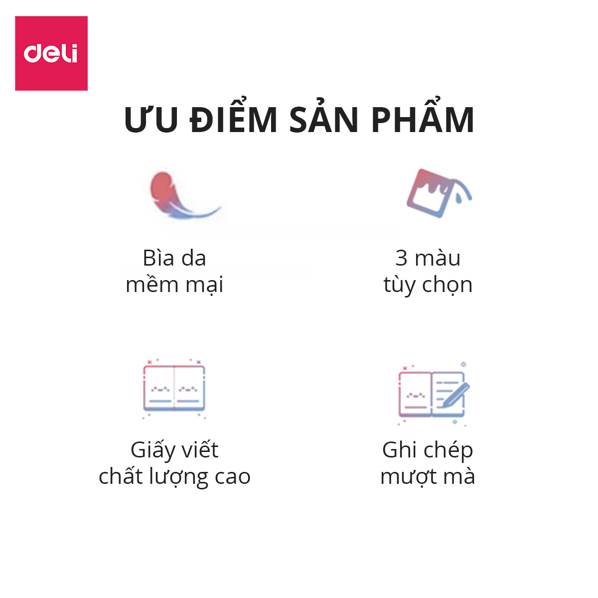 Sổ tay ghi chép A5 Bìa Da Deli TÍNH NĂNG SẢN PHẨM: ️Bìa chất liệu da PU cao cấp, chống nước, màu sắc tươi sáng ️Lõi giấy 80 và 100 gsm dày dặn, viết trơn