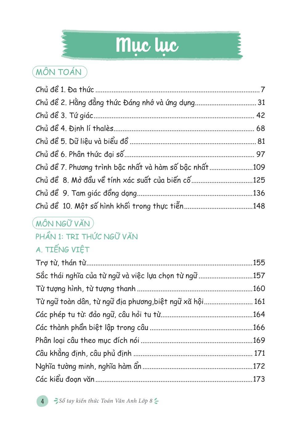 Cuốn sách này ra đời với sứ mệnh giúp học sinh lớp 8 hệ thống hóa kiến thức, nội dung của chương trình lớp 8 các môn Toán, Ngữ Văn và Tiếng Anh. Cuốn sách được thiết kế theo chương trình sách giáo khoa mới giúp các em học sinh dễ học, dễ ghi nhớ, dễ tra cứu và ôn tập.