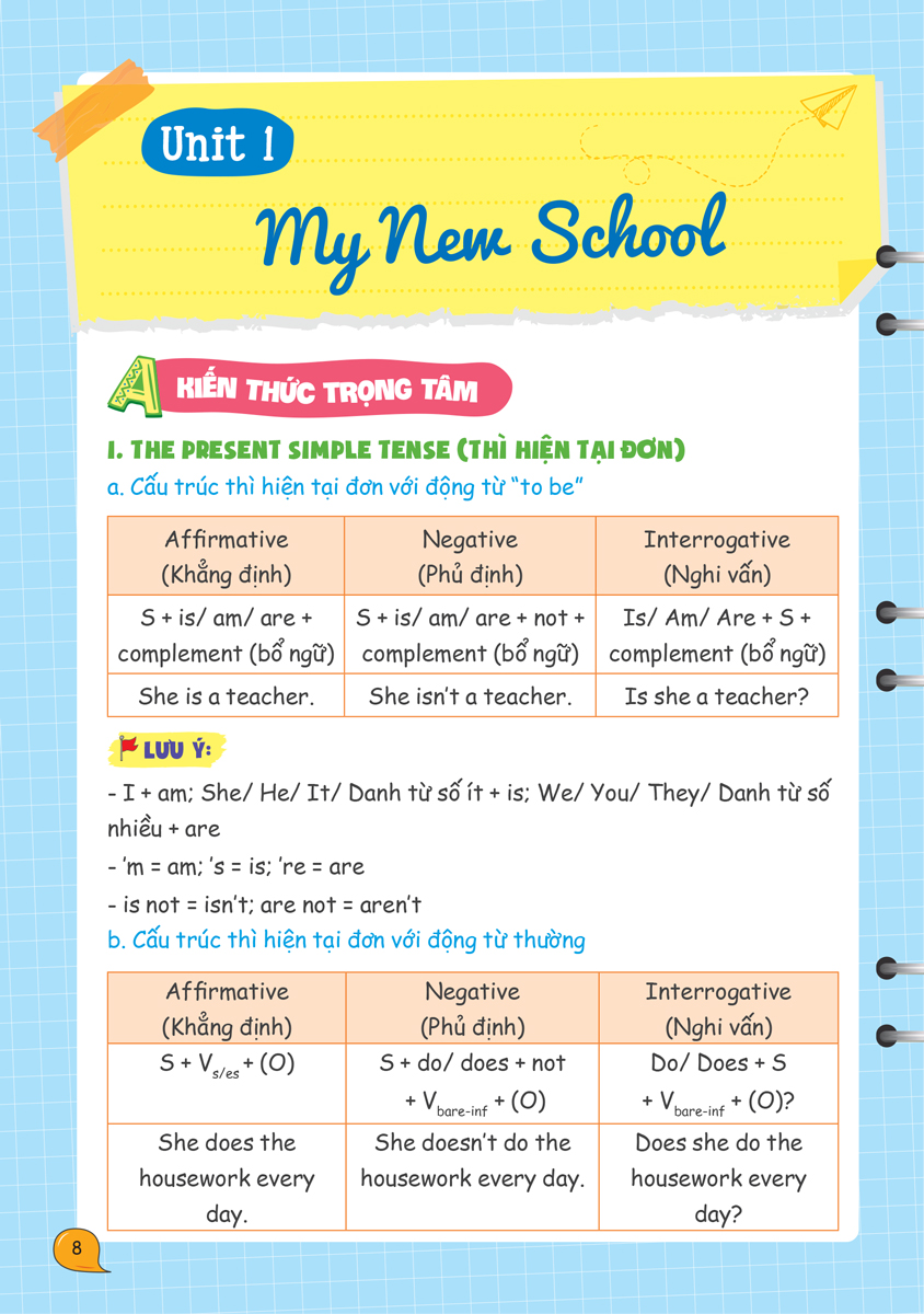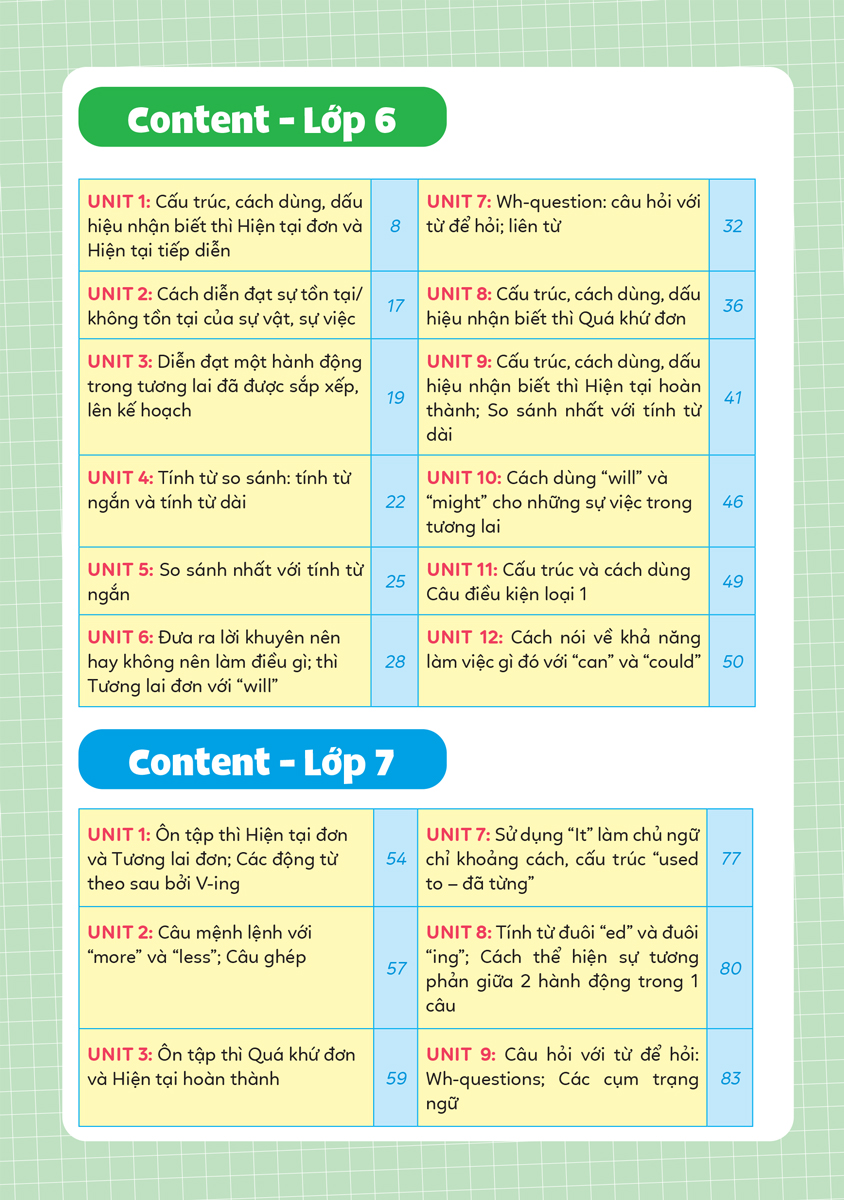 - Sách hệ thống các kiến thức trọng tâm của chương trình học Cuốn sách bám sát khung chương trình Tiếng Anh Trung học cơ sở của Bộ Giáo dục và Đào tạo chia làm các chủ đề tương ứng với chương trình học tiếng Anh của ,, , Cuốn sách giới thiệu các cấu trúc ngữ pháp tiếng Anh một cách ngắn gọn, trọng tâm, có kèm ví dụ minh họa cụ thể giúp các em dễ dàng ghi nhớ và vận dụng.