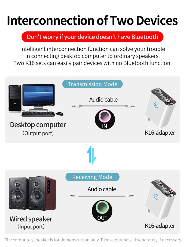Bộ thu phát âm thanh Bluetooth 5.0 chuyển đổi tín hiệu âm thanh số K16 có độ bền cao, giúp chuyển đổi tín hiệu âm thanh từ Digital sang Analog cho chất lượng âm thanh to, rõ ràng, đảm bảo truyền tín hiệu ổn định, sạch chất lượng cao, không nhiễu, tạp âm Thiết bị thu phát không dây K16 hỗ trợ chuyển đổi tín hiệu âm thanh đầu ở vào như Bluetooth, thẻ TF, đĩa USB, AV3.5 từ các nguồn tivi, âm ly, máy tíển đổi đầu ra các ngõ âm thanh RAC, AV3.5, Bluetooth Đầu ra giao diện kép AUX + RAC, có thể kết nối 2 loa và thiết bị khác cùng lúc K16 tích hợp modun sạc nhanh QC 2.0, hỗ trợ sạc nhanh USB kép 2.1A, dễ dàng sạc cho điện thoại di động, máy tính bảng, Kết nối điều khiển ứng dụng chơi nhạc điện thoại di động, máy tí có thể chuyển đổi bài hát lên và xuống / điều chỉnh âm lượng / điều chỉnh hiệu ứng âm thanh / chuyển đổi nguồn phát Hỗ trợ remoss điều khiển từ xa bật / tắt / tắt tiếng / phát / tạm dừng / tăng giảm bài hát / tăng / giảm âm lượng / chuyển đổi nguồn âm Hỗ trợ nhận Bluetooth và truyền Bluetooth , hai chức năng trong một Bộ thu phát âm thanh số K16 Bluetooth 5.0 có thể đọc thẻ TF/USB, hỗ trợ các bài hát định dạng mp3 / flac / wav / wam / ape Tích hợp chip nhớ tự động tắt nguồn khi không sử dụng. Tự động kết nối lại sau khi bật, ghi nhớ chế độ, âm lượng, bài hát, thiết bị ghép nối trước khi tắt Thông tin sản phẩm: Mã sản phẩm: K16 Sử dụng chip Bluetooth V5.0, tích hợp chip giải mã HD Kết nối: Chuẩn Bluetooth 5.0 - 3.5mm+RAC Điện áp: 220V/50Hz Cổng sạc USB kép: 5V/2.1A (max) Hỗ trợ thẻ nhớ, đĩa USB: < 64Gb (max) Bán kính truyền nhận bluetooth hiệu quả: 10m, tích hợp chip giải mã HD Tốc độ truyền: 20 Mbps Hỗ trợ điều khiển Trọng lượng: 250g Kích thước: 575020mm Bộ sản phẩm bao gồm: 01 Bluetooth K16 01 Cáp 3.5mm 2 đầu 01 Điều khiển 01 Sách hướng dẫn