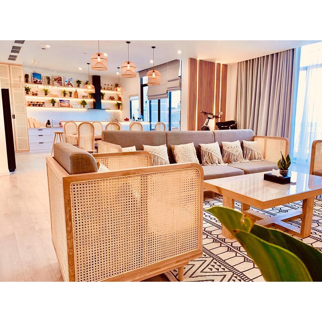 Chiếc Sofa Mây Rattan Văng Bọc Vải Nỉ Hiện Đại mang đậm phong cách Rustic được chế tác từ gỗ tần bì (sồi nhập khẩu). Việc sử dụng đan mây tự nhiên dựa trên khung gỗ được thi công chắc chắn vừa mang lại sự vững chắc vừa khiến cho không gian trở nên thoáng đạt hơn thay vì những thiết kế thành khối lớn, phần chân áp sàn chiếm diện tích không gian phòng khách như các sản phẩm ghế sofa khác. Sản phẩm có sự kết hợp giữa gỗ sồi và mây đan tự nhiên tạo nên một không gian sang trọng, lịch lãm cho phòng khách của gia đình bạn. Chúng tôi tạo ra nó và thổi hồn vào từng đường nét với mong muốn sản phẩm đến tay khách khàng bằng cả sự hài lòng và tin tưởng. Phần đệm và gối tựa lưng cũng được EcoCor đầu tư nghiên cứu kỹ, để mang đến độ bền cao, sự thoải mái, cam kết đem đến những trải nghiệm thú vị cho quý khách hàng. Sofa Mây Rattan này được dùng làm ghế Sofa phòng khách chung cư, biệt thự, liền kề,đều phù hợp. Dùng cho những quán Cafe sang trọng là một trong những điểm nhấn thu hút khách hàng.