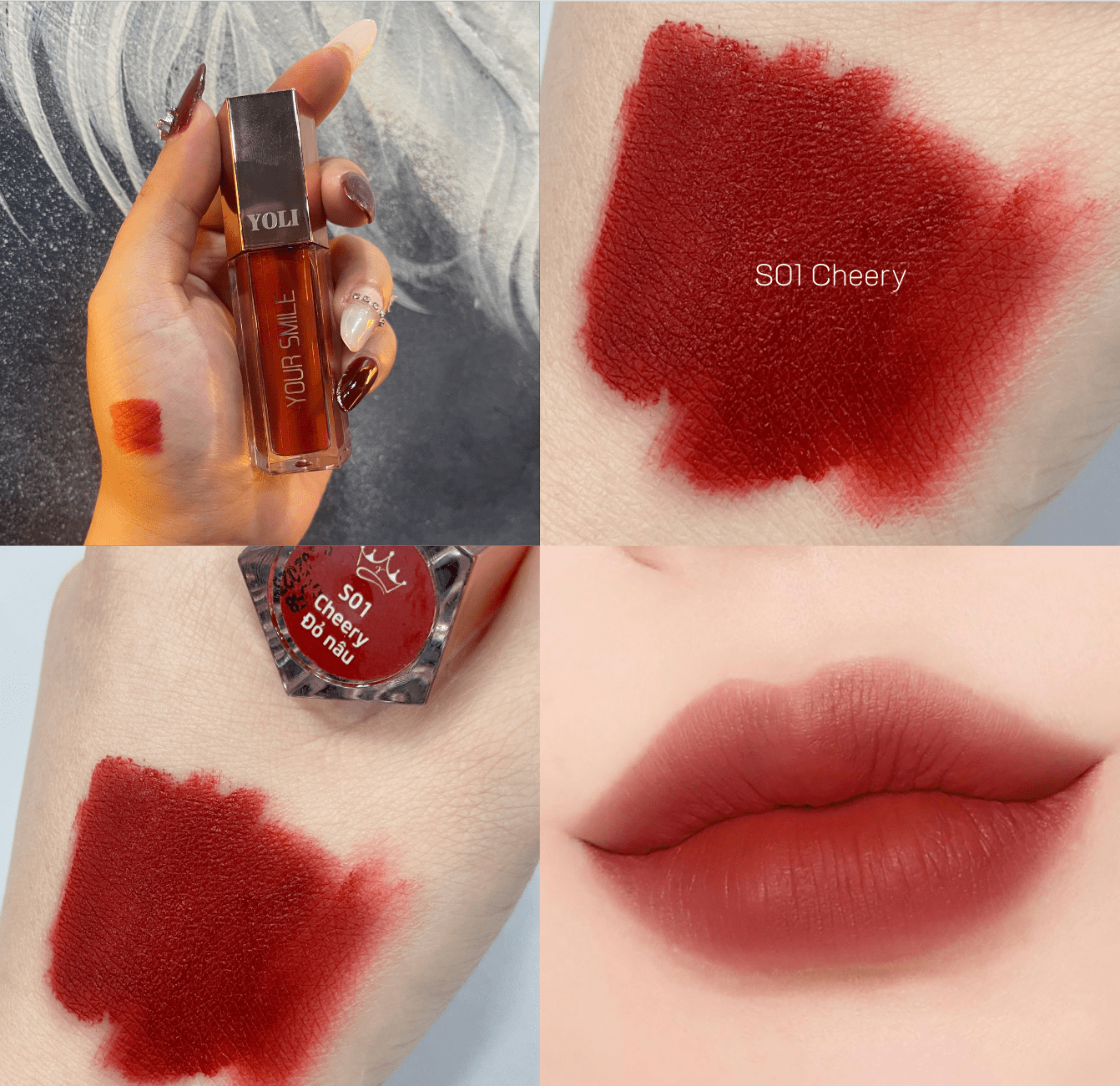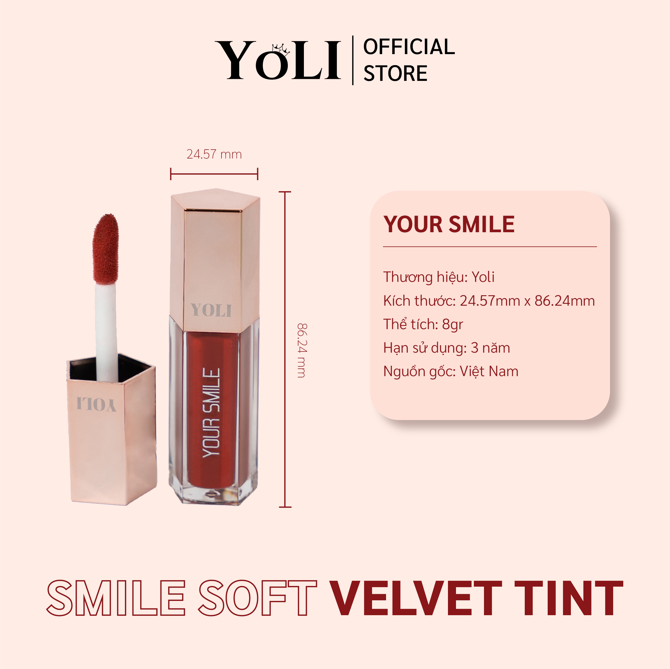 - Yoli Smile Soft Velvet Tint là dòng son kem với kết cấu mỏng mịn, độ bền màu cao, lên môi mướt mịn như nhung, không gây bết dính, nặng môi hay vón cục khi sử dụng.