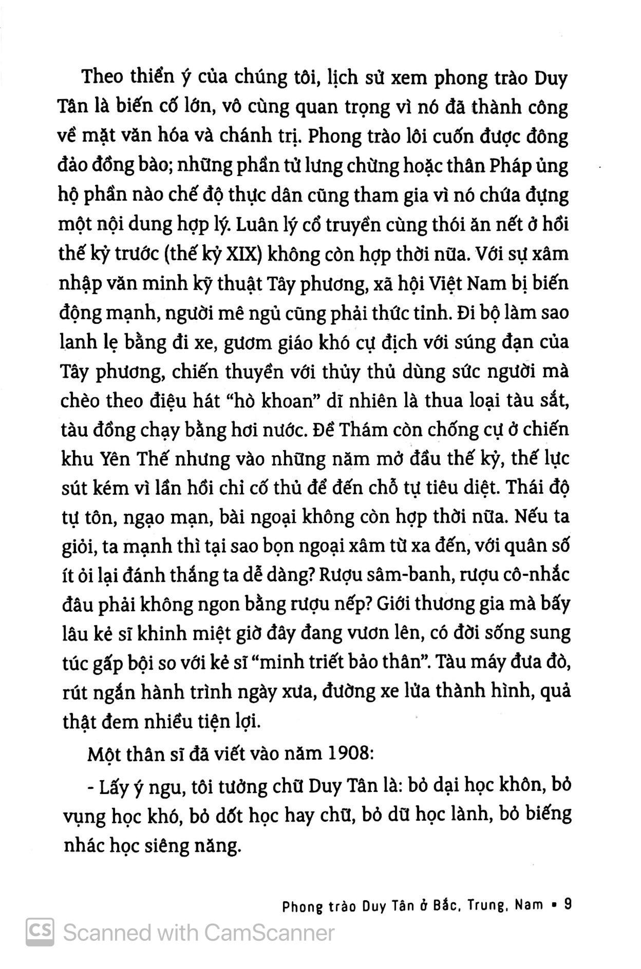 "Phong trào Duy Tân" là cuộc đấu tranh chính trị, kinh tế, văn hoá của nhân dân ba miền vào khoảng những năm 1903 - 1908 nhằm mở mang dân trí, đánh đổ ách thống trị của thực dân Pháp. Bạn đọc có thể đã từng biết đến phong trào này qua 2 tập sách: "Phongtrào Duy Tân ở Bắc, Trung, Nam"; "Miền Nam đầu thế kỷ XX - Thiên địa hội và cuộc MinhTân" do Lá Bối và Đông Phố xuất bản năm 1975. Cuốn biên khảo này, đã gộp 2 tập trên làm một, giúp bạn đọc có cái nhìn toàn diện hơn về phong trào Duy tân ở VN đầu thế kỷ XX, đồng thời giúp cho việc tra cứu thêm thuận tiện.