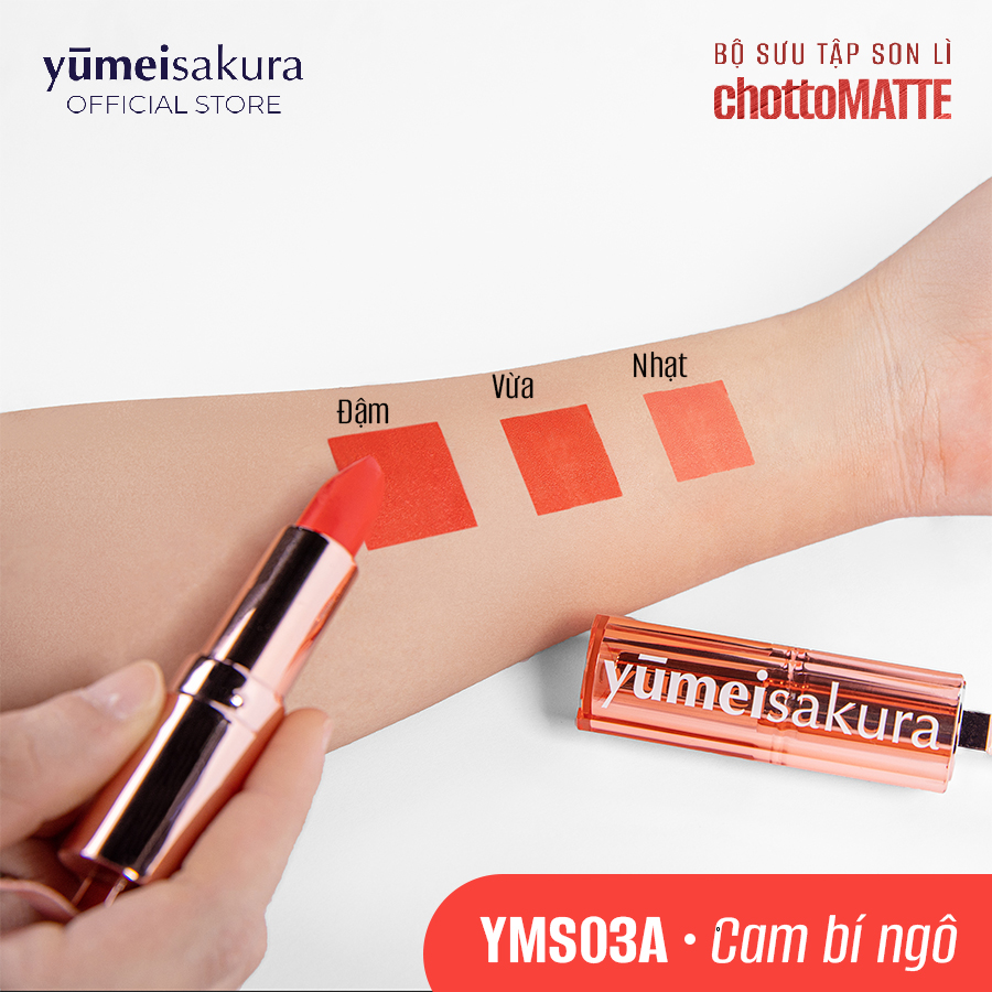 - Thiết kế mới độc đáo, sang trọng và tiện dụng BẢNG MÀU VỚI 08 MÀU SON THỜI THƯỢNG: Tháng 05/2023, Yumeisakura chính thức chào đón thêm 3 màu son mới “quen mà lạ, lạ mà quen” vào bảng màu đa sắc son ChottoMATTE. YMS11 - Kiss Me Maroon - Đỏ gạch (Mới): Nụ hôn nồng nàn khiến bao trái tim thổn thức YMS18 - Milky Orange - Cam sữa (Mới): Sự kiêu sa đầy quyến rũ của phụ nữ hiện đại YMS19 - Sweetie Coral Pink - Hồng san hô (Mới): Tô điểm nét duyên dáng đầy khí chất YMS03A - Pumpkin Orange - Cam Bí Ngô: Bùng nổ năng lượng sôi nổi tích cực YMS07 - Candy Apple - Đỏ Cam: Thỏa đam mê nổi bật YMS15 - Love Me Tony Pink - Hồng Đất: Dịu dàng, nữ tính và ngọt ngào YMS16 - Bronze Orange - Cam Nâu Đất: Tôn vinh nét phóng khoáng, cá tính độc bản YMS17 - Burgundy Red - Đỏ Rượu Sẫm: Quyến rũ, sang trọng và quyền lực Sở hữu những màu sắc trendy, thời thượng và lôi cuốn, 8 màu son của Yumeisakura hứa hẹn sẽ khiến hàng triệu cô gái mê mệt trước sự quyến xinh đẹp, quyến rũ này! THIẾT KẾ MỚI ĐỘC ĐÁO VÀ ẤN TƯỢNG Thiết kế lấy cảm hứng từ những viên tinh thể trong suốt, sắc hồng rose gold thời thượng tạo nên vẻ ngoài sang trọng độc đáo nhưng cũng không kém phần tiện dụng khi có thêm chi tiết khóa treo son giúp dễ dàng mang theo bên người. CÁCH BẢO QUẢN