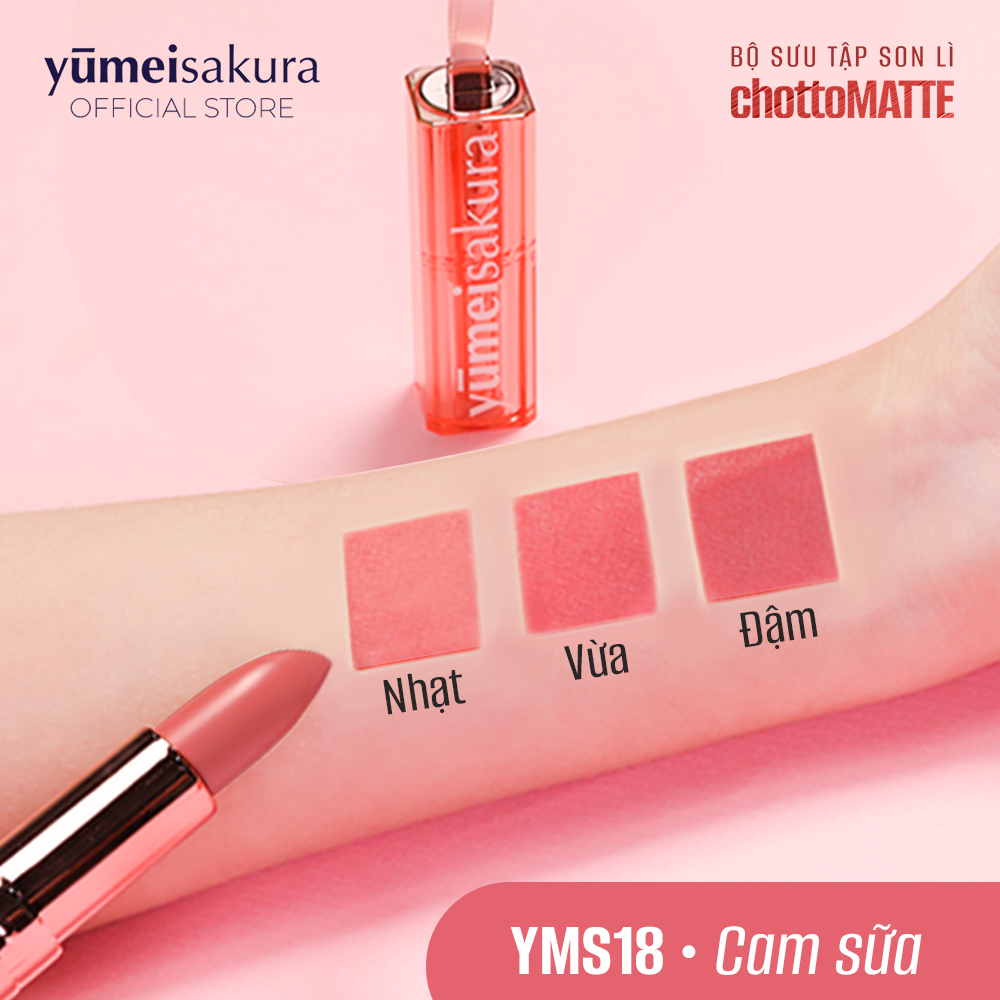 - Thiết kế mới độc đáo, sang trọng và tiện dụng Tháng 05/2023, Yumeisakura chính thức chào đón thêm 3 màu son mới “quen mà lạ, lạ mà quen” vào bảng màu đa sắc son ChottoMATTE. YMS11 - KISS ME MAROON - ĐỎ GẠCH Là một trong ba màu son “quen mà lạ, lạ mà quen” được thêm vào bộ sưu tập đa sắc son của Yumeisakura, YMS11 - Kiss Me Maroon hứa hẹn sẽ tạo làn sóng gây bão cộng đồng làm đẹp trong thời gian tới. Sự pha trộn đầy tinh tế và độc đáo của sắc đỏ thời thượng, cháy bỏng và sắc nâu đất trầm ấm, hiện đại, tất cả tạo nên tổng thể đầy quyến rũ, sang trọng và quý phái, đích thực là một trong những màu son đẹp nhất không thể thiếu trong tủ đồ makeup của phái nữ. Độ Hot của màu son không này không phải chỉ nằm ở sự pha trộn độc đáo giữa sắc đỏ và nâu, đây là một trong những màu son hiếm hoi phù hợp với mọi tone da. Đối với da trắng, màu đỏ gạch là sự lựa chọn hoàn hảo giúp làn da trắng càng thêm trắng mà không hề bị xỉn màu. Không chỉ giúp tôn da thần kì, màu son còn khiến từng đường nét trên khuôn mặt trở nên sắc sảo và quyến rũ gấp bội. Đối với da ngăm, màu đỏ gạch sẽ tăng cao sự khoẻ khoắn và cá tính, rất phù hợp với những phong cách trang điểm đậm, giúp bạn bùng nổ visual cực Tây. YMS18 - MILKY ORANGE - CAM SỮA Là một trong ba màu son “quen mà lạ, lạ mà quen” được thêm vào bộ sưu tập đa sắc son của Yumeisakura, YMS18 - Milky Orange hứa hẹn sẽ chinh phục hàng triệu cô gái bởi màu son cá tính và cực kỳ thu hút. Với sắc cam nude tươi sáng, rạng rỡ hài hoà với ánh hồng nữ tính, ngọt ngào, trẻ trung, màu son tạo cảm giác thanh lịch, kiêu sa đầy quyến rũ của người phụ nữ hiện đại. YMS18 - Milky Orange hội tụ đầy đủ những yếu tố cần thiết, độc lạ mà phái nữ tìm kiếm bao lâu nay: Nhẹ nhàng, sang trọng, quyến rũ, chất son lì mà vẫn ẩm mượt giúp môi căng mướt và tươi sắc trong thời gian dài. Khác với những sắc cam sữa thông thường, YMS18 - Milky Orange được thêm chút sắc hồng để giúp cân bằng lại độ sáng, để cho màu son lên môi trông hài hoà và tôn da hiệu quả. Đối với da trắng, màu Cam sữa chính là “chân ái” của bạn đó! Không chỉ khiến nhan sắc thăng hạng rạng rỡ, màu son còn khiến cho diện mạo tươi trẻ, hack tuổi cực kỳ bất ngờ. Đối với da ngăm, màu son này tạo nên thần thái cực kỳ thu hút với sắc diện cực Tây, tươi trẻ, thanh thoát và căng tràn sức sống. YMS19 - SWEETIE CORAL PINK - HỒNG SAN HÔ Là một trong ba màu son “quen mà lạ, lạ mà quen” được thêm vào bộ sưu tập đa sắc son của Yumeisakura, YMS19 - Sweetie Coral Pink dự là sẽ khiến nhan sắc của bạn nổi bần bật khiến bao người phải nhớ thương đó nha! Sự kết hợp độc đáo giữa sắc hồng nữ tính, ngọt ngào, đáng yêu với ánh màu san hô (coral) tạo cảm giác trẻ trung, năng động và bừng sáng cho khuôn mặt luôn rạng rỡ cả ngày dài. Nhắc đến tone son hồng chắc hẳn sẽ có không ít chị em bỏ qua bởi sắc son tương đối kén da, chỉ phù hợp với những người sở hữu làn da trắng nổi bật. Tuy nhiên, màu son hồng san hô lại có thể sử dụng phù hợp cho mọi làn da. Sắc son hồng san hô nhẹ nhàng, có thể khiến khuôn mặt “bừng sáng” chỉ trong tích tắc. Màu son giúp khuôn mặt thêm nổi bật, tươi tắn và đặc biệt trẻ trung hơn. Son màu hồng san hô được đánh giá là lựa chọn hoàn hảo dành cho những cô nàng châu Á sở hữu làn da vàng đặc trưng. Dưới tông da vàng, những thỏi son màu hồng san hô được thổi bừng sức sống mang đến hiệu ứng tuyệt đẹp giúp cho đôi môi và gương mặt của các nàng trở nên thu hút hơn với từng đường nét được tôn lên tuyệt đối. Dù đi học, đi làm, đi chơi hay đi hẹn hò thì thỏi son màu hồng san hô vẫn là lựa chọn vô cùng lý tưởng. GIỚI THIỆU VỀ BST SON LÌ CHOTTO MATTE Trong tiếng Nhật, Chotto Matte có nghĩa “chờ một chút”, trong đó, chotto là một chút và matte là chờ. Chotto Matte - Chờ một chút là câu cửa miệng mà chắc hẳn bất kỳ cô gái nào cũng đã vài lần thốt lên như thế. Chờ một chút dặm lại miếng son, thoa thêm chút phấn,... tất cả cũng là vì để xuất hiện thật xinh đẹp trước thế giới đang chờ ngoài kia. Yêu nhiều hơn! Vui nhiều hơn! Xinh nhiều hơn! Với một chút son đến từ bộ sưu tập Chotto Matte của nhà Yumeisakura.