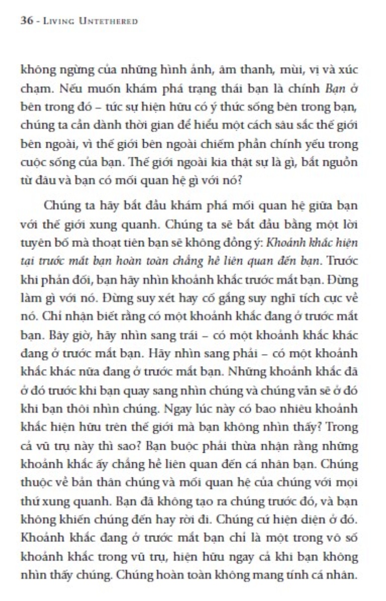 Bằng cách hướng dẫn bạn quan sát và thấy ra Bản ngã sáng suốt – bản thể chân thật của mình, thấy ra nguyên lý vận hành của tâm trí, trái tim và năng lượng nội tại trước những sự kiện xảy ra ở thế giới bên ngoài, Michael Singer chỉ dẫn bạn làm thế nào để giải phóng mọi mô thức tích tụ bên trong để trở về trạng thái tự do tuyệt vời vốn có của nội tâm và tận hưởng từng khoảnh khắc của đời sống diễn ra trước mắt bạn.