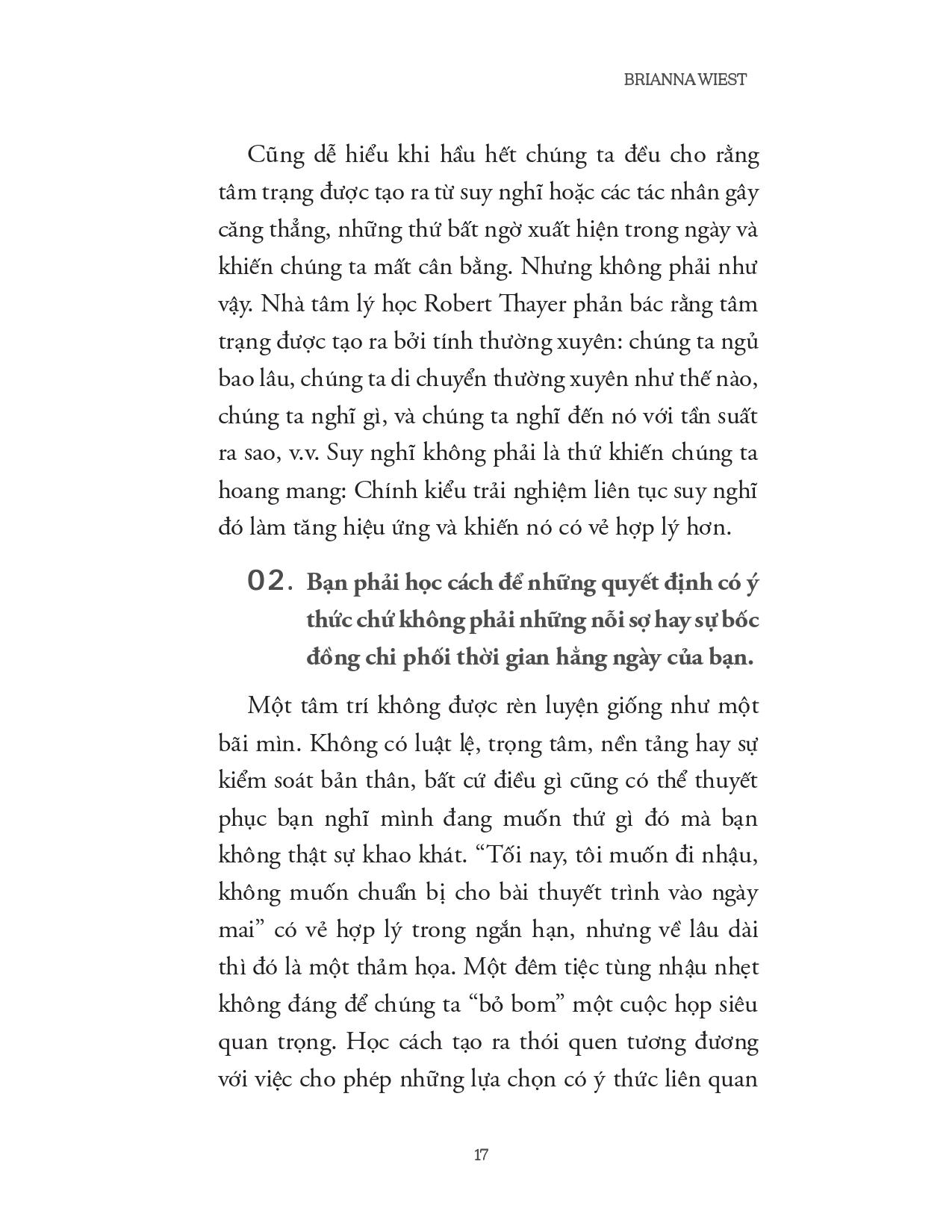 Brianna Wiest là nhà văn, nhà thơ người Mỹ. Cô đã dành phần lớn thời gian trong sự nghiệp viết lách của m.ình để giúp mọi người thúc đẩy tiềm năng thực sự của họ. Sau nhiều năm viết và chia sẻ những hiểu biết sâu sắc về chính hành trình thức tỉnh và chữa lành, cùng những ý tưởng sáng tạo và hữu ích, những cuốn sách của Briana nhanh chóng trở thành hiện tượng toàn cầu, bán được hơn 1 triệu bản và đang được dịch sang hơn 20 ngôn ngữ trên toàn thế giới. Các tác phẩm của cô cũng đồng thời được đăng trên các website nơi mà cô hiện đang là đối tác như Forbes, USA Today, The Huffington Post, và Thought Catalog.