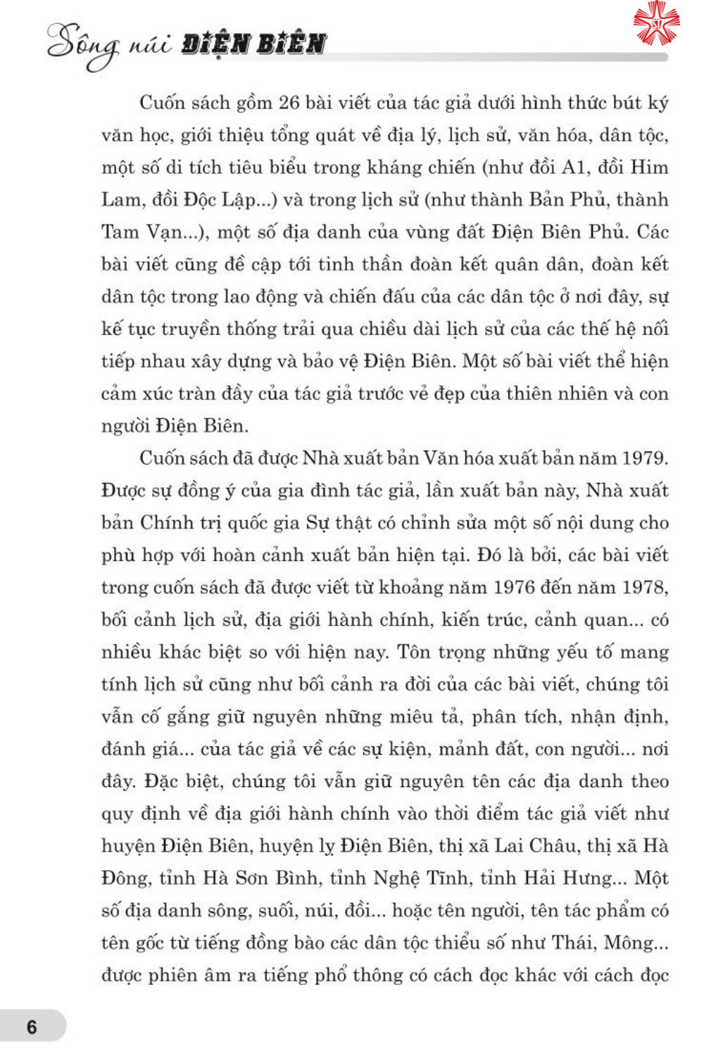 Điện Biên phủ, một mảnh đất lịch sử lừng lẫy cũng là một mảnh đất vô cùng phong phú về mặt đất nước và con người. Yêu quí Điện Biên, ai chẳng muốn tìm hiểu Điện Biên. Cuốn sách Sông núi Điện Biên này nhằm đáp ứng yêu cầu đó trong một chừng mực nhất định.