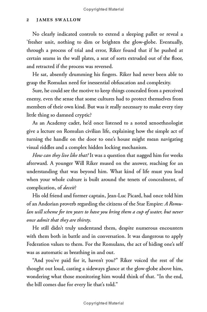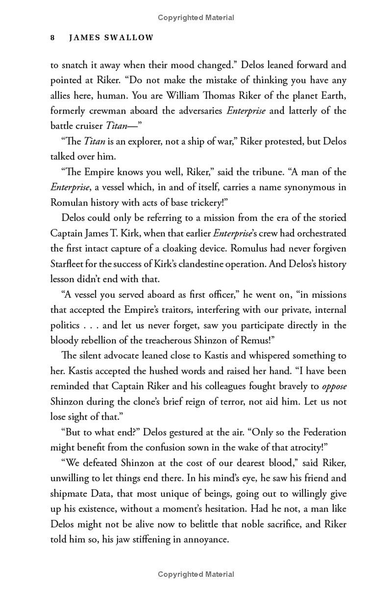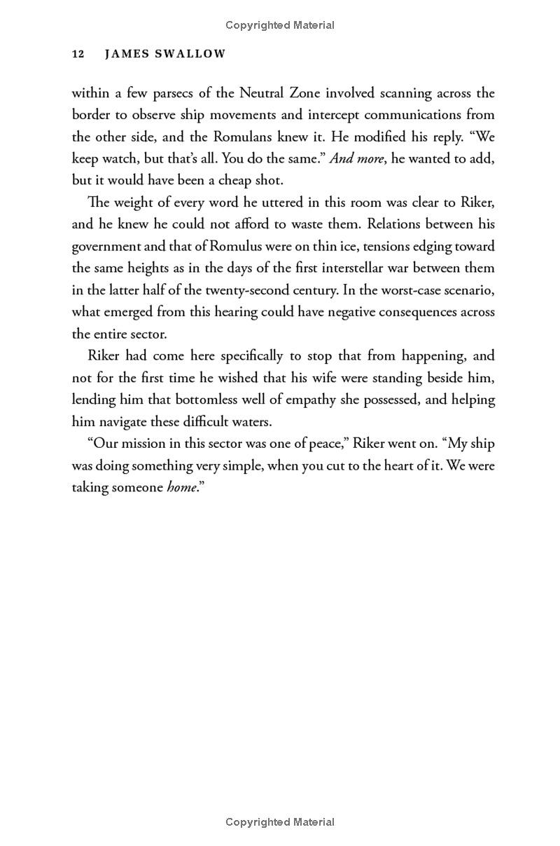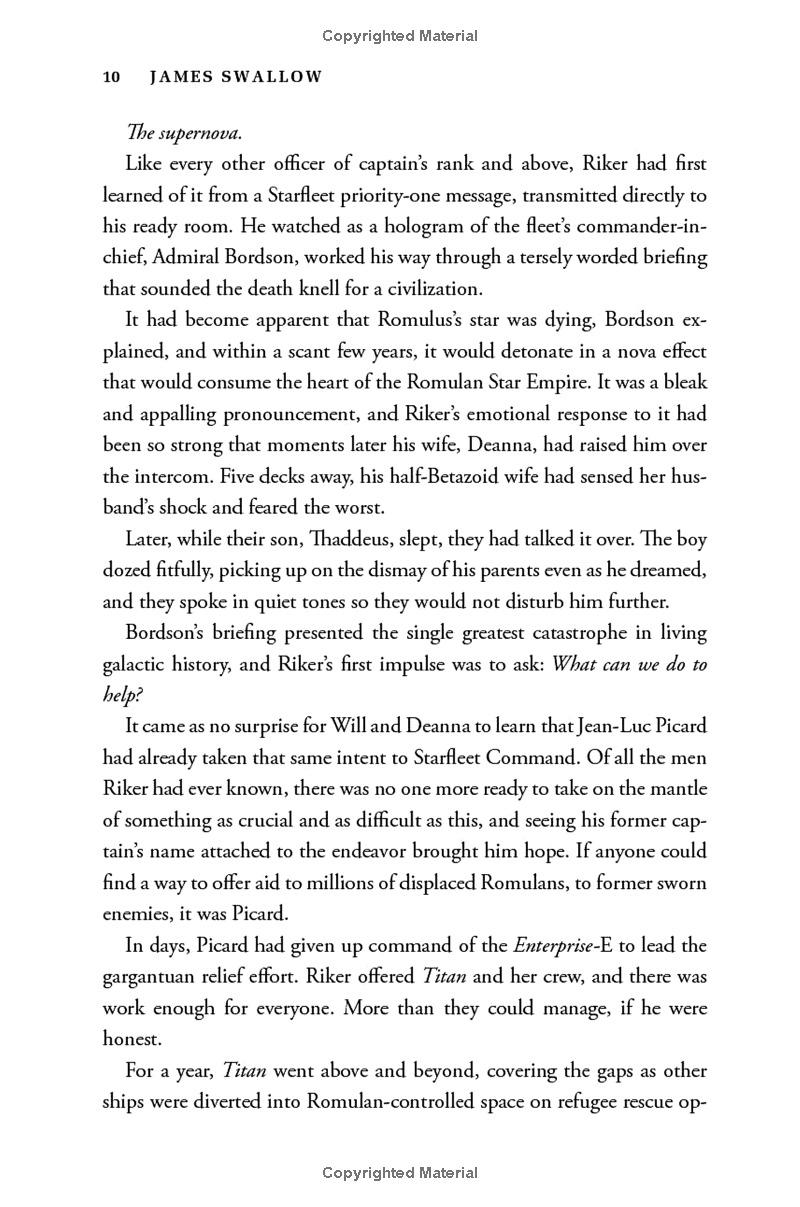Within the United Federation of Planets, a terrorist strike on the shipyards of Mars has led to the shutdown of all relief efforts for millions of Romulans facing certain doom from an impending supernova. But when the USS Titan is drawn into a catastrophic incident on the Romulan-Federation border, Captain William Riker, his family, and his crew find themselves caught between the shocking secrets of an enigmatic alien species and the deadly agenda of a ruthless Tal Shiar operative. Forced into a wary alliance with a Romulan starship commander, Riker and the Titan crew must uncover the truth to stop a devastating attack—but one wrong move could plunge the entire sector into open conflict!