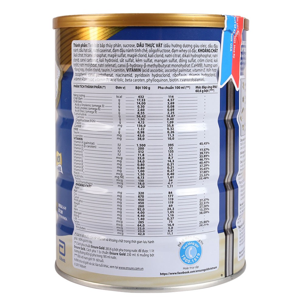 - Ensure Gold chứa hỗn hợp chất béo thực vật giàu acid béo Omega 3-6-9 tốt cho tim mạch. Hàm lượng acid béo no và Cholesterol thấp có lợi cho chế độ ăn lành mạnh Hương vị thơm ngon- Ensure Gold với hương vị thơm ngọt mang tới cảm giác ngon miệng mà không gây ngấy- Sản phẩm không chứa Trans Fat (acid béo chuyển đổi), Gluten và Lactose HƯỚNG DẪN SỬ DỤNG SẢN PHẨM