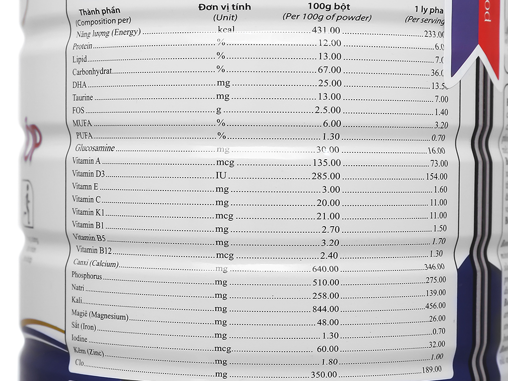 1. Thành phần: Sữa bột, Whey protein, Soy protein, Maltodextrin, Sữa non, L-Lysine HCL, FOS, Canxi Nano, Taurine, Choline, DHA, ARA, Vitamin (Vitamin A, Vitamin C, Vitamin D, Vitamin E, Vitamin D3, Vitamin K2,