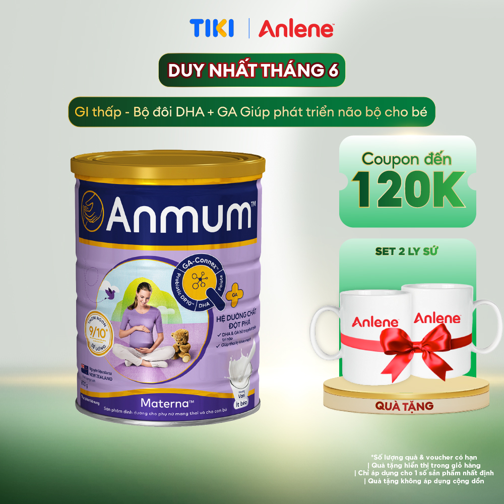Sữa Bột Dành Cho Mẹ Bầu Anmum Materna Hương Vanilla 800g - Tặng Set 2 ly sứ Giới thiệu Anmum Materna hương vani là sữa bột dinh dưỡng tốt nhất dành cho phụ nữ mang thai và cho con bú. Với các dưỡng chất Mind-Q Nutrient Bundle, Anmum Materna là một trong những sản phẩm sữa tốt nhất hiện nay trên thị trường. Chỉ với 2 ly sữa bột Anmum Materna hương vani, nhu cầu Folate, Kẽm và Canxi mỗi ngày của bà bầu đã được đáp ứng đầy đủ. Trong khi Kẽm hỗ trợ trong việc duy trì sự trao đổi chất và chức năng thần kinh khỏe mạnh, thì Canxi củng cố răng và xương. Folate đóng một vai trò quan trọng trong việc phân chia tế bào lành mạnh ở cả mẹ và con, ngăn ngừa dị tật ống thần kinh ở trẻ sơ sinh. Thành phần Sữa bò (77,92%) (sữa bột không béo, sữa bột nguyên kem), maltodextrin, inulin, hỗn hợp chất béo sữa, đường, khoáng chất, DHA, vitamin, lecithin đậu nành, hương Vani, Probiotic. Đặc điểm nổi bật Sữa Anmum cho bà bầu là nguồn dinh dưỡng dồi dào cho cả mẹ và con. Chứa đầy DHA và GA, Anmum có hiệu quả cao trong việc phát triển trí não cũng như cơ thể của em bé. Nó cũng chứa sắt đóng vai trò trung tâm trong việc hình thành các tế bào hồng cầu, hỗ trợ cần thiết cho việc tăng 50% lượng máu trong thai kỳ. Ít chất béo, Anmum Materna hương vani là một trong những thức uống lành mạnh nhất cho phụ nữ mang thai và cho con bú. Sữa bột Anmum là loại sữa bột duy nhất dành cho bà bầu có chứa DR10. DR10 kết hợp với Inulin probiotic, cung cấp khả năng miễn dịch mạnh hơn và tiêu hóa khỏe mạnh. Ngoài ra sữa bột Anmun còn có dòng sữa bột Anmum Materna vị sô-cô-la thơm ngon. Công dụng Anmum Materna là sản phẩm đặc chế dành riêng cho phụ nữ mang thai và cho con bú giúp bổ sung dưỡng chất cần thiết cho mẹ bầu trong suốt thai kỳ. Hướng dẫn sử dụng Làm một ly sữa bổ dưỡng cho cả mẹ và bé chưa bao giờ đơn giản đến thế. Chỉ cần cho 4 muỗng (khoảng 42g) Sữa bột Anmum vào 1 ly (200ml) nước và khuấy đều. Bạn cũng có thể uống lạnh để tận hưởng hương vị của sữa. Thêm Anmum Materna vào chế độ ăn uống của phụ nữ mang thai làm tăng khả năng sinh thường và giúp ít biến chứng hơn. Nó cũng giúp giảm thiểu nguy cơ thai chết lưu, tử vong ở trẻ sơ sinh, bệnh tật và dị tật bẩm sinh. Hướng dẫn bảo quản Bảo quản nơi khô ráo. Luôn đậy kín sau khi sử dụng. Sử dụng trong vòng 1 tháng sau khi mở nắp hộp. Tiêu chuẩn an toàn Sản phẩm được sản xuất trên dây chuyền công nghệ hiện đại, đạt tiêu chuẩn chất lượng quốc tế. Lưu ý sử dụng Sản phẩm này không phải là thuốc và không có tác dụng thay thế thuốc chữa bệnh. Khuyến cáo Sữa mẹ là nguồn dinh dưỡng tốt nhất cho sự tăng trưởng và phát triển tối ưu của trẻ. Nó chứa một tỷ lệ thích hợp của tất cả các chất dinh dưỡng cần thiết để đáp ứng tổng nhu cầu dinh dưỡng của bé trong 6 tháng đầu tiên. Điều cực kỳ quan trọng đối với một bà mẹ cho con bú là có một chế độ ăn uống lành mạnh và cân bằng. Quyết định không cho trẻ bú mẹ hoặc cho trẻ bú bình một phần có thể tác động tiêu cực đến nguồn sữa mẹ và là một quyết định khó thay đổi. Vui lòng tham khảo ý kiến ​​chuyên gia chăm sóc sức khỏe của bạn để được tư vấn.