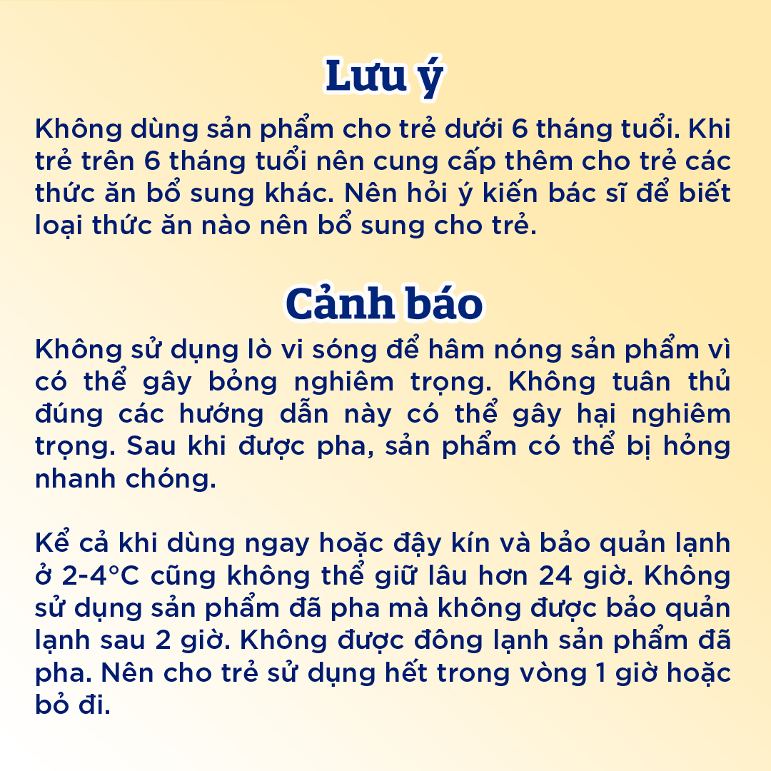 - Sức khỏe của trẻ tùy thuộc vào sự tuân thủ chặt chẽ các hướng dẫn sau đây. Vệ sinh, chuẩn bị dụng cụ, pha chế, sử dụng và bảo quản đúng cách rất quan trọng trong quá trình pha chế sữa cho trẻ. Sản phẩm không vô trùng và không nên dùng cho trẻ sinh non hoặc trẻ nhỏ có vấn đề về miễn dịch trừ khi có chỉ định và có sự giám sát của bác sĩ. Nên hỏi ý kiến bác sĩ để biết loại sản phẩm sữa bột phù hợp với con bạn.