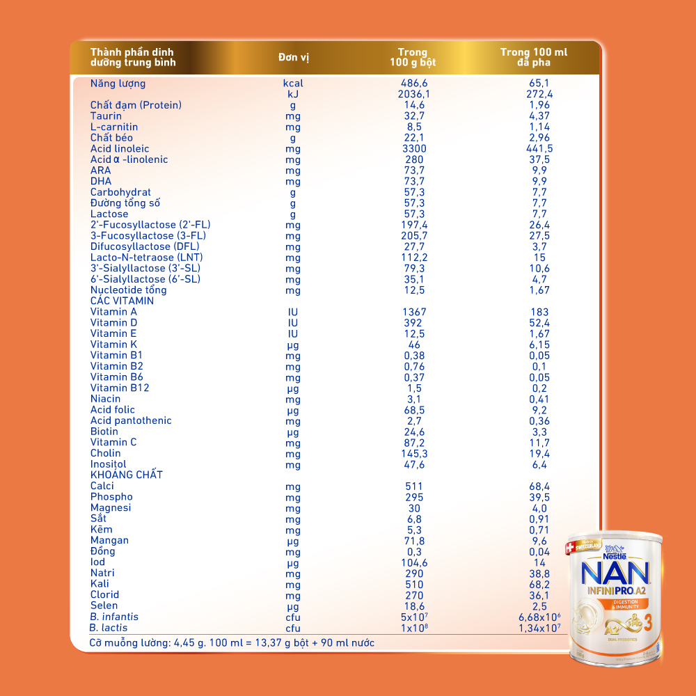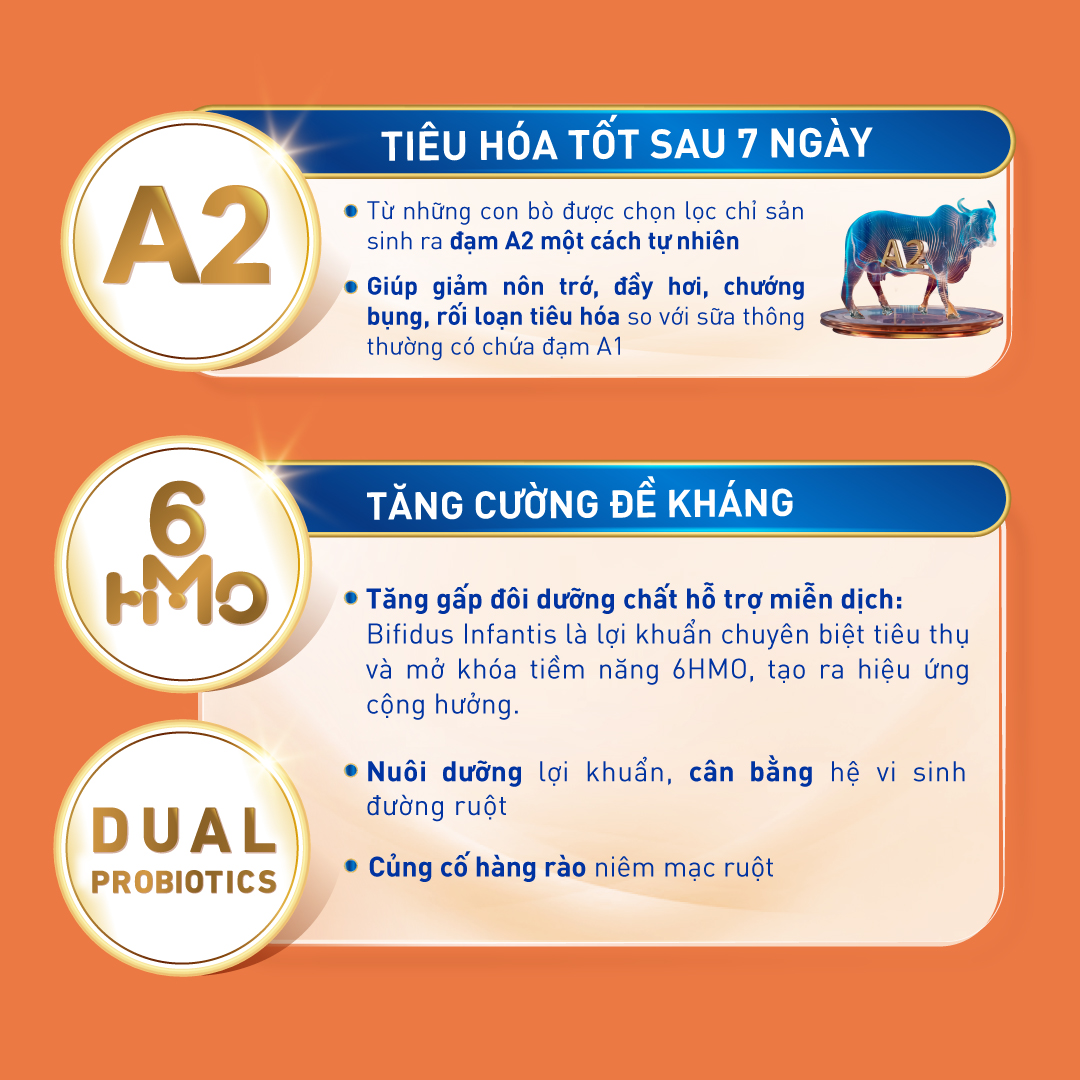 Thành phần: SỮA A2 tách kem 29% (A2 Skimmed MILK powder), LACTOSE (từ SỮA-from MILK), WHEY khử khoáng (từ SỮA-WHEY PROTEIN from MILK), Hỗn hợp dầu (dầu hướng dương giàu acid Oleic, dầu hạt cải có hàm lượng acid Erucic thấp, dầu hướng dương, dầu nấm Mortierella alpina, dầu vi tảo Schizochytrium sp., chất chống oxy hóa (Tocopherol concentrat dạng hỗn hợp, Ascorbyl palmitat)), Các vitamin (C, E, Nicotinamid, B5, B1, A, B6, B2, Acid folic, K1, Biotin, D3, B12), Các khoáng chất (Calci citrat, Natri citrat, Dikali hydro phosphat, Magnesi Clorid, Sắt (II) sulphat, Kali citrat, Kẽm sulfat, Đồng sulfat, Mangan sulfat, Kali iodid, Natri selenat), Oligosaccharide (3-Fucosyllactose, 2'-Fucosyllactose, Lacto-N-tetraose, 3'-Sialyllactose, 6'-Sialyllactose, Difucosyllactose), Maltodextrin, Chất nhũ hóa Lecithin ĐẬU NÀNH (SOYA lecithin), Choline bitartrate, Taurine, Chất điều chỉnh độ acid Natri hydroxyd, Inositol, Lợi khuẩn (Bifidobacterium longum subsp. infantis, Bifidobacterium lactis), Nucleotide (Cytidine, Uridine, Adenosine, Guanosine), Chất điều chỉnh độ acid Acid citric, L-carnitine.