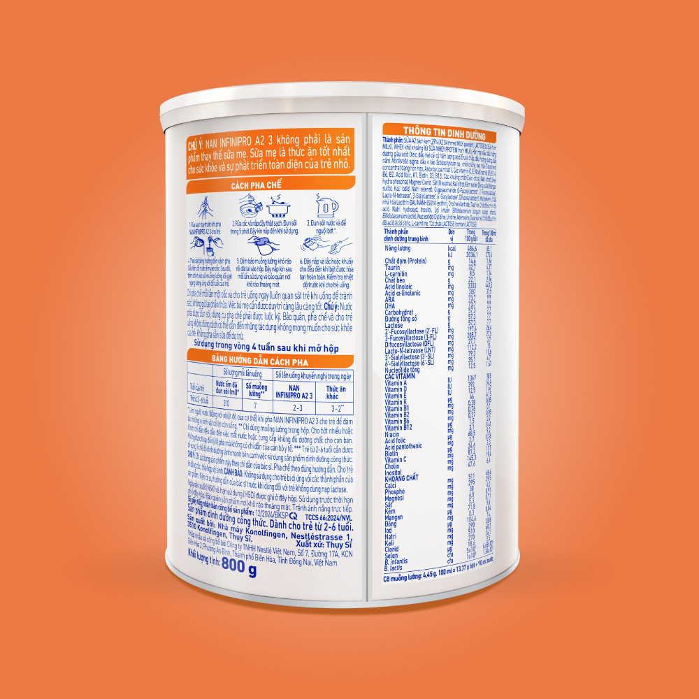 Tên sản phẩm: Sản phẩm dinh dưỡng công thức Nestlé NAN INFINIPRO A2 3 800g Xuất xứ: Thụy Sĩ Khối lượng tịnh: 800g/lon Độ tuổi phù hợp: 2 - 6 tuổi Thành phần: SỮA A2