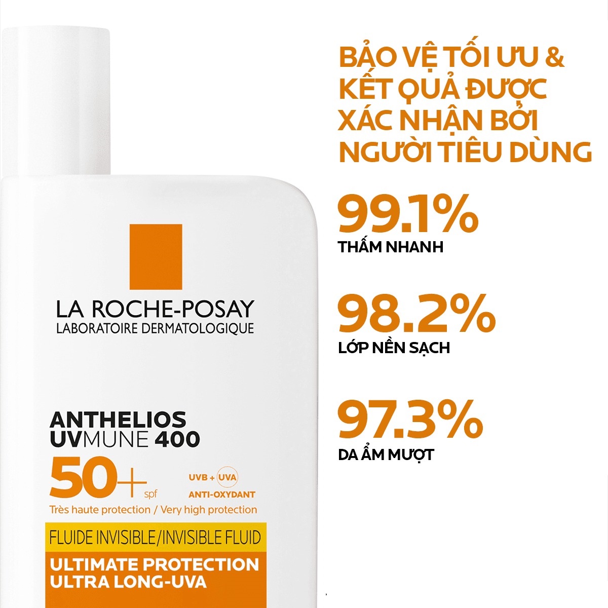 Mua tại TiktokLa Roche-Posay Anthelios Fluide Invisible Uvmune 400 SPF50+ Loại : Không hương liệu Dung tích: 50ml Kem chống nắng La Roche-Posay Anthelios Fluide Invisible Uvmune 400 SPF50+ là dạng kem chống nắng dạng lỏng siêu mỏng nhẹ, dùng được cho mọi loại da - kể cả da nhạy cảm, hoặc da dễ dị ứng với môi trường, thời tiết hay ánh nắng mặt trời. Có thể dùng cho vùng mắt. Không gây dị ứng. Không nhờn dính. Kem chống nắng La Roche-Posay Anthelios Fluide Invisible Uvmune 400 SPF50+ là: