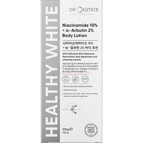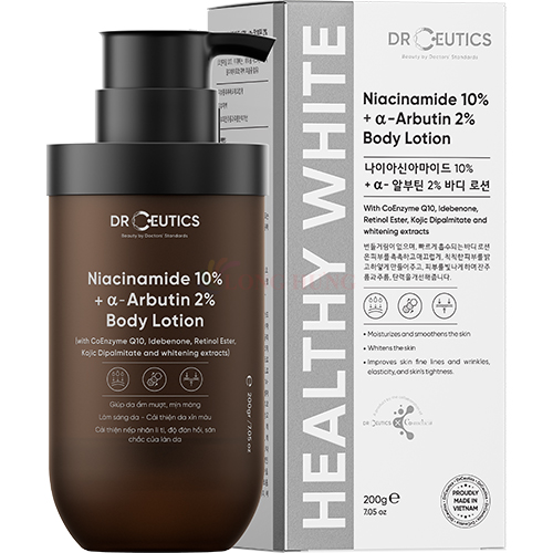 Sữa dưỡng thể DrCeutics Niacinamide 10% + Alpha Arbutin 2% Body Lotion   Thành phần chính:  10% Niacinamide (Vitamin B3): Có tác dụng làm sáng da một cách mạnh mẽ và an toàn bằng cơ