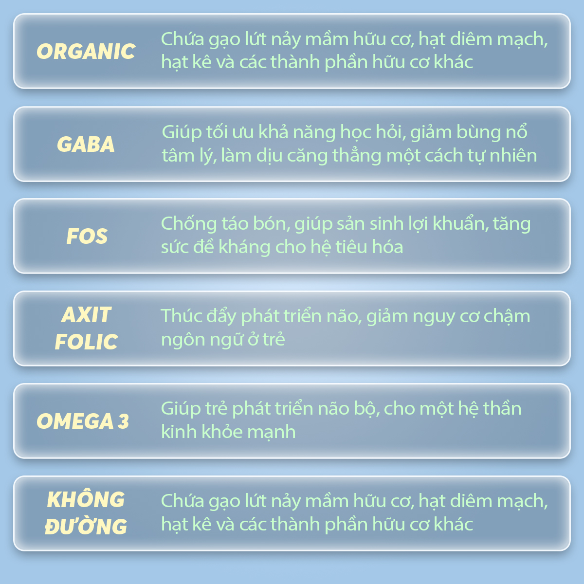 - Thích hợp cho trẻ không dung nạp lactose / sữa hoặc dị ứng sữa đậu nành / nhạy cảm với gluten