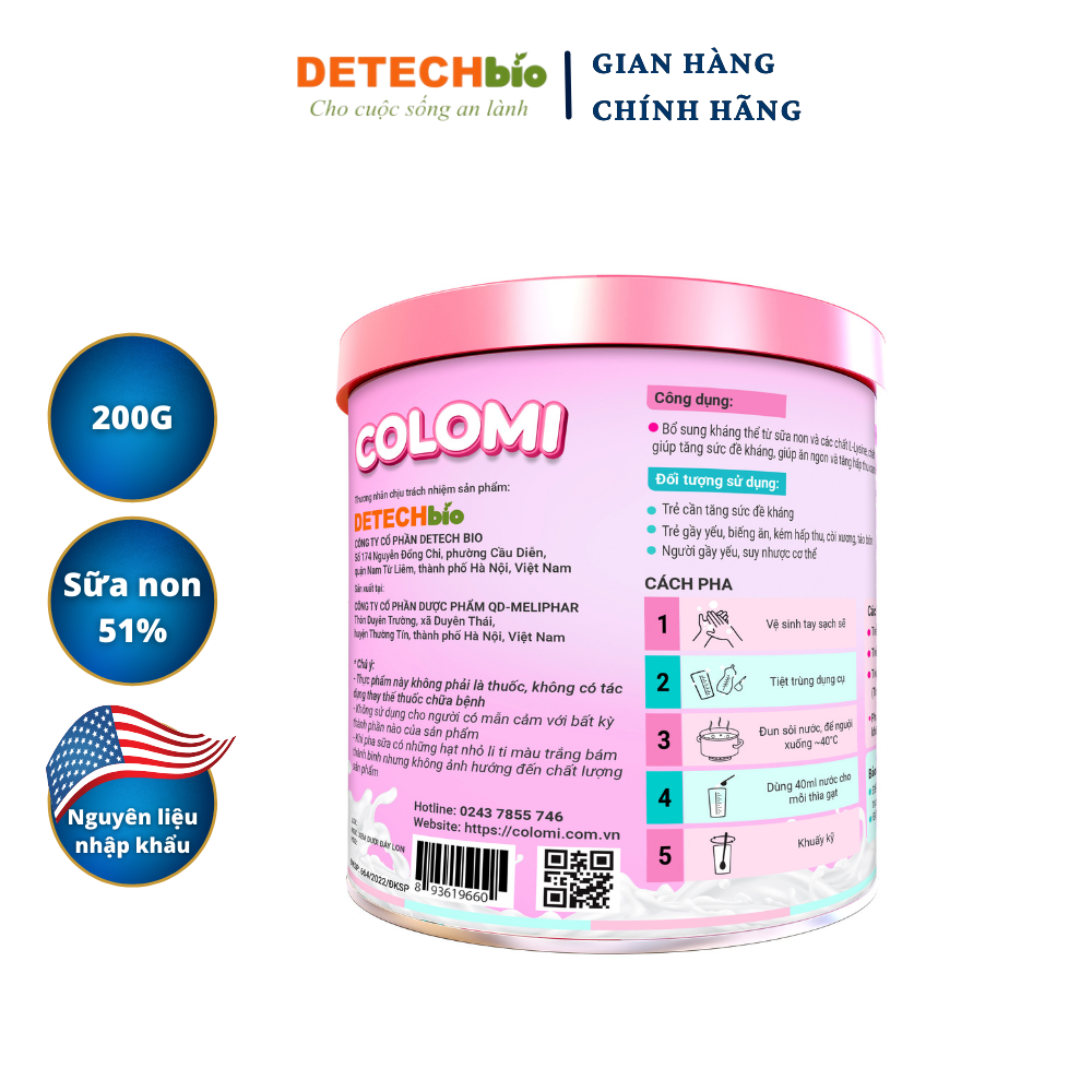 Sữa non cao cấp Colomi tốt cho trẻ cần tăng trưởng toàn diện, trẻ hay ốm vặt, biếng ăn, trẻ sinh non, ít bú mẹ…   3 ĐIỂM NỔI BẬT CỦA SỮA NON CAO CẤP COLOMI   • Sữa non cao cấp Colomi góp phần giúp trẻ tăng sức đề kháng, hạn chế ốm vặt nhờ các kháng thể quý như IgG, IgM, Lactoferrin… • Sữa non cao cấp Colomi góp phần giúp trẻ có hệ tiêu hoá khoẻ mạnh, tăng hấp thu, ăn ngon mỗi ngày nhờ bộ đôi chất xơ FOS và Inulin. • Sữa non cao cấp Colomi bổ sung thành phần Lysine góp phần giúp hấp thu canxi, tạo collagen để giúp quá trình tạo mô liên kết của da, xương, sụn, giúp thúc đẩy và phát triển chiều cao, cân nặng. BÉ KHOẺ - MẸ AN TÂM KHI MUA SỮA NON CAO CẤP COLOMI • Sữa non cao cấp Colomi có nguồn nguyên liệu sữa non được Tập đoàn DETECH nhập khẩu trực tiếp từ Tập đoàn APS Labelle (Mỹ). APS Labelle là tập đoàn hàng đầu về cung cấp nguồn sữa non trên thế giới. • Sữa non cao cấp Colomi được sản xuất theo tiêu chuẩn GMP và được phân phối bởi Tập đoàn DETECH. Tập đoàn DETECH thành lập 1991 (30 năm) với bề dày về nhập khẩu, sản xuất và thương mại. • Sữa non cao cấp Colomi lưu hành tại thị trường Việt Nam được cấp phép bởi Bộ Y tế. • Đội ngũ chuyên gia, đội ngũ tư vấn chuyên nghiệp luôn đồng hành vì sự phát triển của bé yêu của bạn.   MỖI THÁNG BÉ DÙNG BAO NHIÊU SỮA NON COLOMI?   Sữa non cao cấp Colomi là thực phẩm bổ sung, do vậy căn cứ vào liều lượng sử dụng, tuỳ theo độ tuổi, trẻ có thể dùng ở định mức tham khảo dưới đây: • Trẻ dưới 2 tuổi: Mỗi tháng dùng khoảng 1 hộp sữa non Colomi loại 130g hoặc 200g • Trẻ 2-6 tuổi: Mỗi tháng dùng khoảng 1 hộp sữa non Colomi loại 350g (Xem chi tiết hướng dẫn sử dụng trên nhãn sản phẩm)
