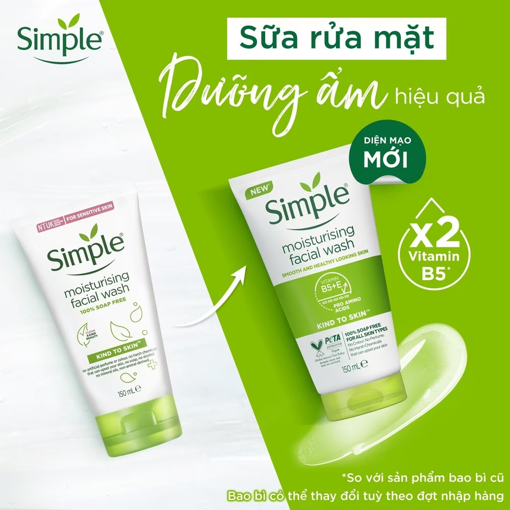 Sữa Rửa Mặt Simple Dưỡng Ẩm 150ml Sữa Rửa Mặt Simple Dưỡng Ẩm 150ml 100% không chứa xà bông nhẹ nhàng rửa sạch lớp trang điểm và tạp chất, cho làn da mềm mịn mơn mởn sức sống. Sữa Rửa Mặt Simple không chứa phẩm màu hay thuốc nhuộm, không chứa hương liệu nhân tạo hay hóa chất gay gắt có thể gây kích ứng da. Thành phần chính và công dụng: