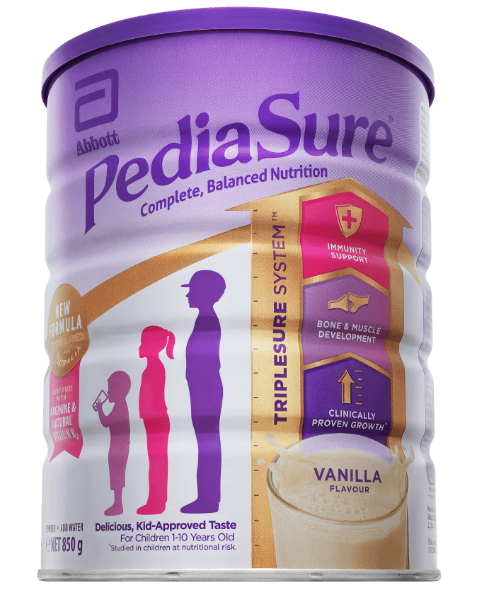 - Complete, Balanced Nutrition (Dinh dưỡng đầy đủ, cân bằng): 850g/lon PediaSure là sản phẩm bổ sung có công thức đặc biệt dành cho trẻ em từ 1–10 tuổi có nguy cơ dinh dưỡng cao. Nó có thể là một phần thường xuyên trong chế độ ăn hàng ngày của trẻ trong khi bạn nỗ lực hình thành thói quen ăn uống lành mạnh. Nó có thể được sử dụng để bổ sung lượng dinh dưỡng giữa các bữa ăn hoặc vào bữa ăn nhẹ. PediaSure không nhằm mục đích thay thế bữa ăn nhưng có thể được sử dụng như một phần của chế độ ăn uống cân bằng ở trẻ em đang có tình trạng: