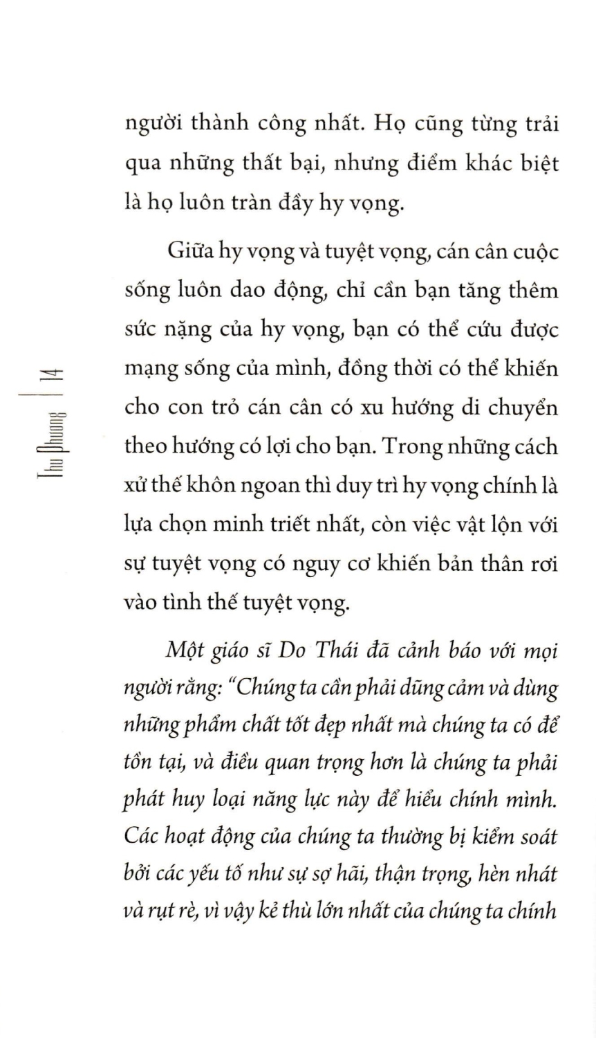 Martin Luther King từng nói: “Chúng ta phải chấp nhận sự thất vọng vì hữu hạn, nhưng chúng ta không bao giờ được mất hy vọng, vì nó là vô hạn”. Không có con đường nào bằng phẳng trong cuộc sống và chúng ta không thể ngừng tiến về phía trước, vì tương lai còn ở phía trước. Những người hạnh phúc không nhất thiết là những người thành công nhất. Họ cũng từng trải qua những thất bại, nhưng điểm khác biệt là họ luôn tràn đầy hy vọng.