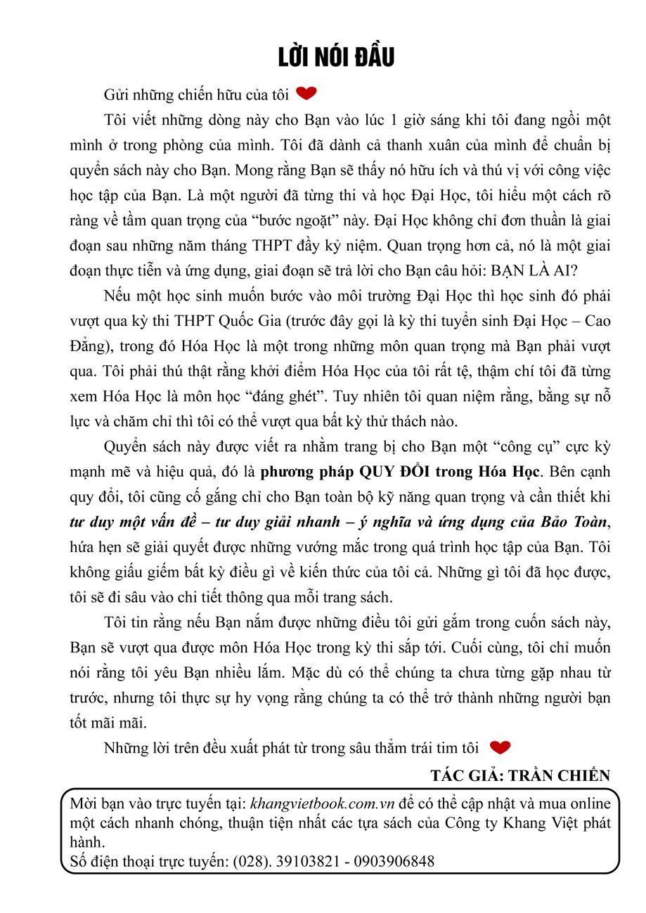 Cuốn sách ôn luyện này được viết ra nhằm trang bị cho các sĩ tử một “công cụ” cực kỳ mạnh mẽ và hiệu quả, đó là phương pháp QUY ĐỔI trong Hóa Học. Bên cạnh quy đổi, tác giả cũng cố gắng chỉ cho bạn toàn bộ kỹ năng quan trọng và cần thiết khi tư duy một vấn đề – tư duy giải nhanh – ý nghĩa và ứng dụng của Bảo Toàn, hứa hẹn sẽ giải quyết được những vướng mắc trong quá trình học tập của bạn.
