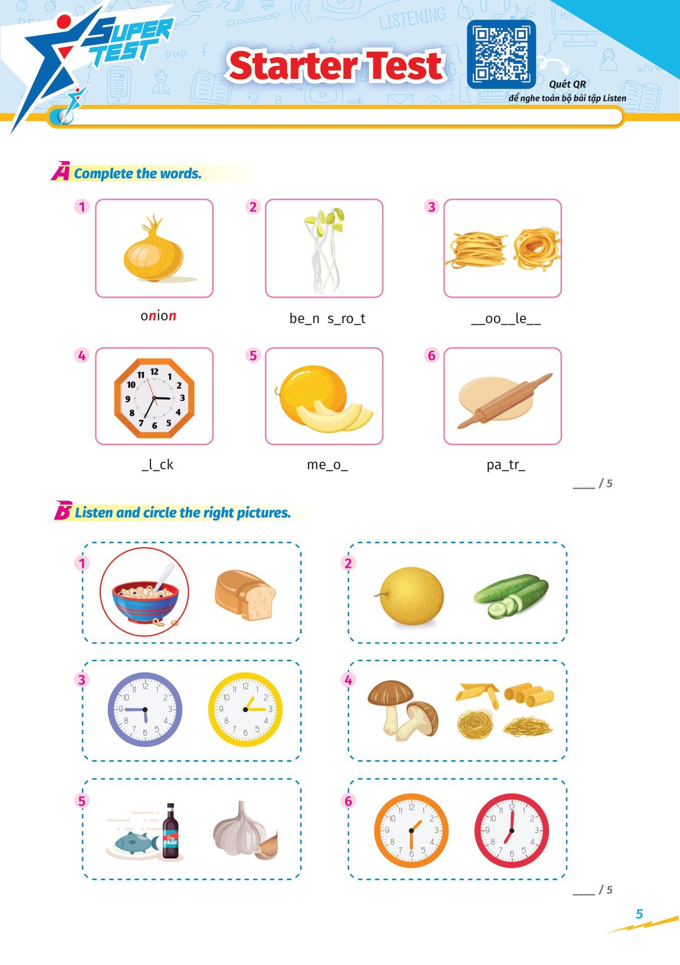 Với Bộ sách Super Test – Đề kiểm tra nhanh Tiếng Anh cho học sinh, bố mẹ sẽ giúp con tiến bộ từng ngày, tự tin với khả năng ngôn ngữ của m.ình khi ôn luyện Tiếng Anh bởi các bài tập về 4 kỹ năng: Nghe – Nói – Đọc – Viết được liên kết với nhau theo logic của bài học.