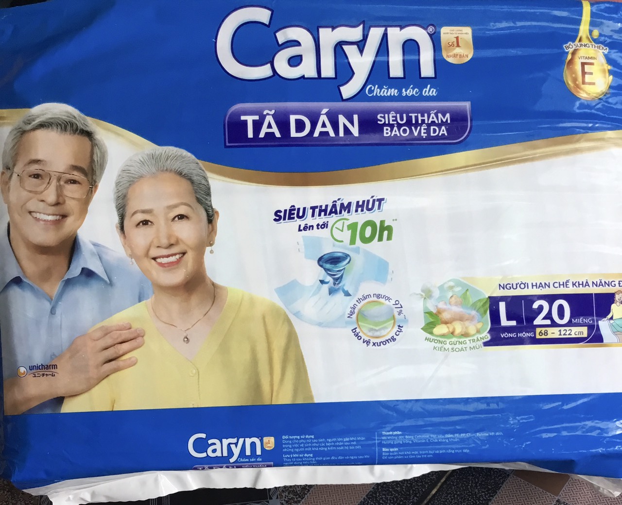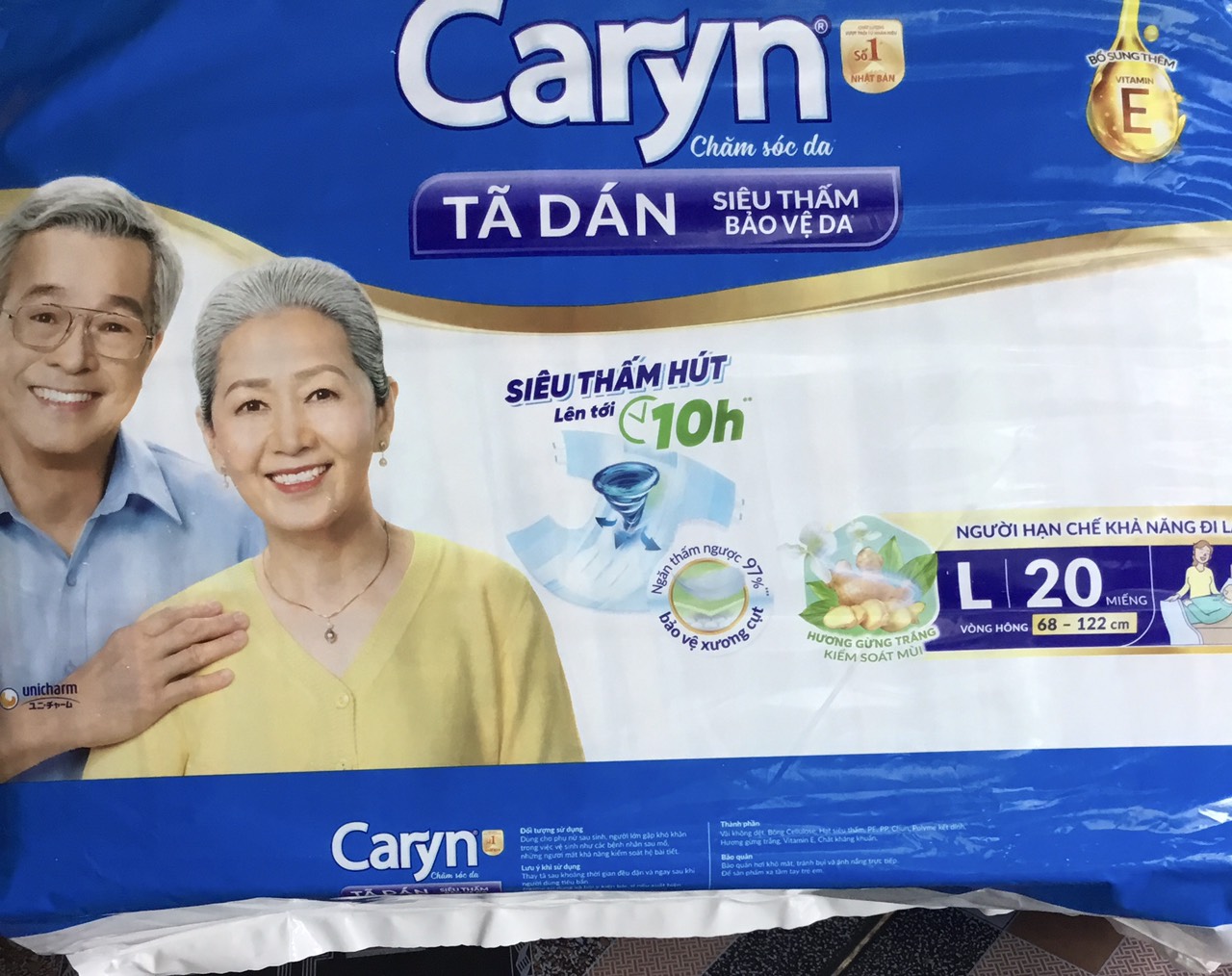 Tã dán Caryn L20 Siêu thấm Đệm thấm xanh bảo vệ vùng xương cụt (20 Miếng) Tã dán Siêu thấm Caryn L20 (mẫu cũ Caryn ML20) cải tiến mới với “Đệm thấm xanh" bảo vệ vùng xương cụt, với các hạt thấm hút tăng cường giúp thấm hút tối đa, ngăn thấm ngược trở lại đến 97%, cho vùng xương cụt thêm khô thoáng, giảm nỗi lo các vấn đề về da, là lựa chọn tốt cho người dùng hạn chế khả năng đi lại. Thiết kế mở tiện thay trong tư thế nằm giúp việc chăm sóc trở nên thật dễ dàng. Dùng cho phụ nữ sau sinh, người lớn gặp khó khăn trong việc vệ sinh như các bệnh nhân sau mổ, những người mất khả năng kiểm soát hệ bài tiết, người hạn chết khả năng đi lại (ngồi hoặc nằm 1 chỗ) Thông tin kích thước: Vòng hông: 68 đến 122 cm Hướng dẫn sử dụng - Mặc với sự trợ giúp của người nhà 1. Nghiêng người dùng sang bên, trải dọc miếng tã theo cơ thể người dùng 2. Xoay người dùng về tư thế nằm, căn chỉnh lại miếng tã cho vừa vặn 3. Kéo phần trước của miếng tã qua chân lên ngang bụng 4. Mở phần khóa dính, dán chéo vào nùng nilon có logo Caryn. Lưu ý, tay giữ vào phần màu xanh để giữ độ bám dính của khóa 5. Dán khóa dính 4 góc sao cho miếng tã ôm sát vào cơ thể người dùng. Điều chỉnh thêm phần mép miếng tã ôm sát đùi Lưu ý: Thay tã sau khoảng thời gian đều đặn và ngay sau khi người dùng tiêu bẩn Ngừng sử dụng và hỏi ý kiến bác sĩ nếu xuất hiện bất thường trên da