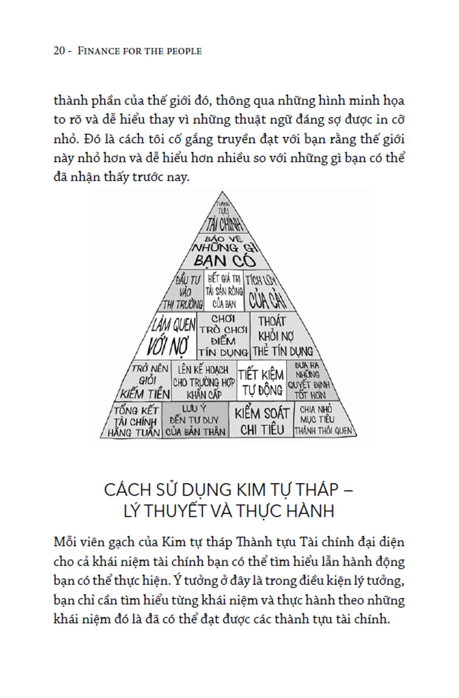 Sách được chia thành 5 phần, mỗi phần tương ứng với một “tầng gạch” trong kim tự tháp tài chính cá nhân, cái mà mỗi người cần chinh phục theo thứ tự từ cơ bản đến nâng cao để đạt đến “đỉnh” thành tựu tài chính.