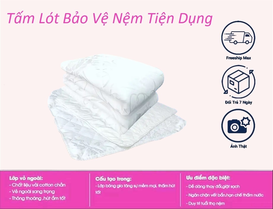 Mô tả chi tiết Lựa chọn tấm bảo vệ nệm có kích thước tương ứng với nệm. Kích thước tiêu chuẩn:1m2x2m; 1m4x2m; 1m6x2m; 1m8x2m; 2mx2m Cấu trúc 3 lớp: 2 lớp ngoài là vải Poly