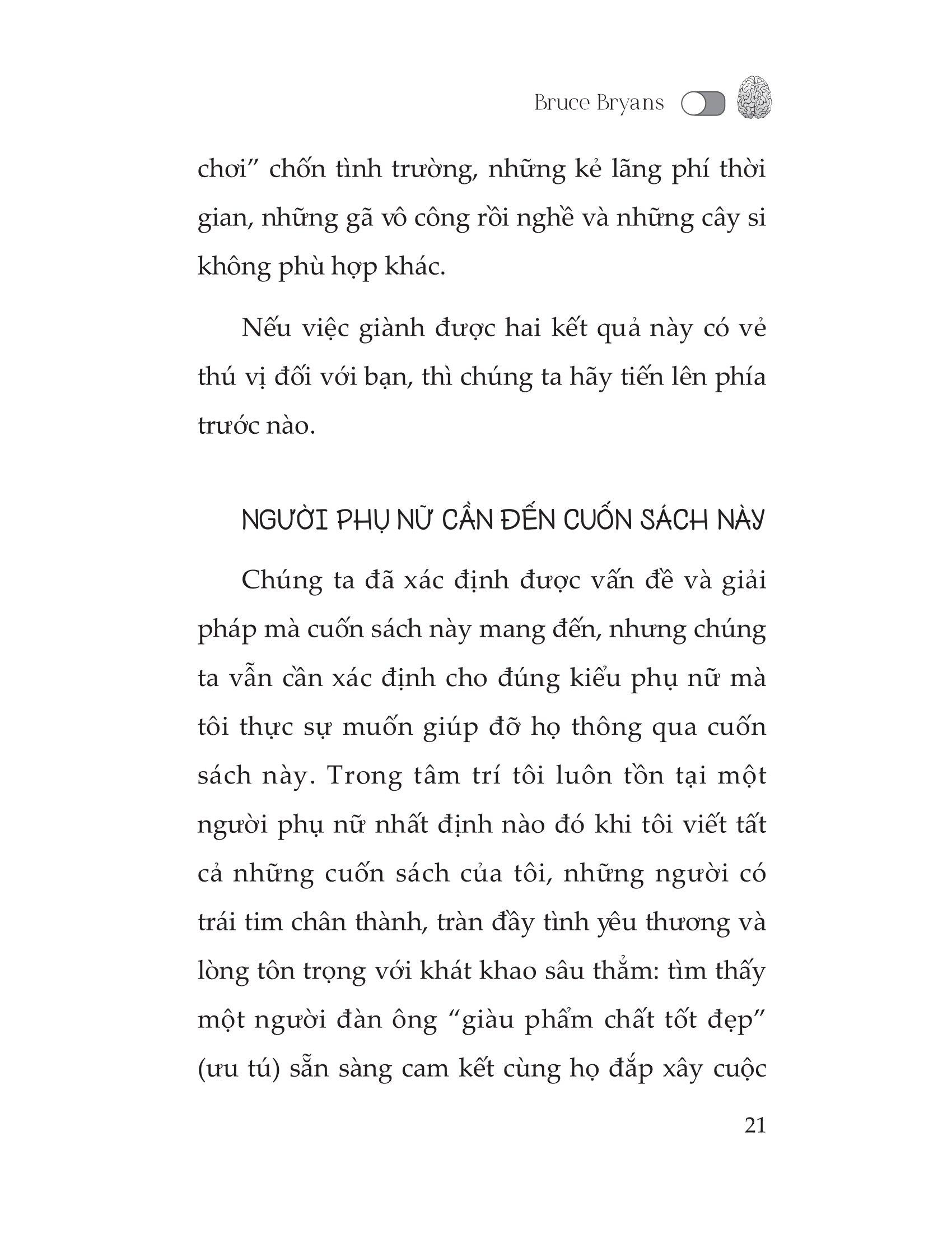 Tâm Lý Đàn Bà - Lý Trí Đàn Ông Đàn ông và phụ nữ vốn là hai chủ thể khác biệt nhau về sinh học, vai trò xã hội và cả trong tình yêu. Nhiều người hay cho rằng, chỉ có tâm lý phụ nữ là khó hiểu, phức tạp. Phụ nữ thường nói không thành có, thường sáng nắng chiều mưa. Trong thực tế, tâm lý đàn ông cũng rất khó nắm bắt, đôi khi họ cũng khá phức tạp và vô cùng khó đoán. Phụ nữ nếu có thể nắm bắt được tâm lý của đàn ông thì sẽ giúp họ dễ dàng hơn trong việc xử lý các tình huống, mâu thuẫn giữa đôi bên, khéo léo gìn giữ hạnh phúc và vun đắp cho mối tình của cả hai. Khi nói đến việc tìm kiếm một người bạn đời phù hợp cho một mối quan hệ nghiêm túc và cam kết, một trong những điều đàn ông mong muốn nhất ở phụ nữ là sự tự chủ, hay nói cách khác là sự đĩnh đạc của phụ nữ. Sự tự chủ ấy sẽ làm tăng giá trị bản thân của người phụ nữ lên gấp nhiều lần. Trong tình yêu, những người phụ nữ ấy luôn biết duy trì sự bí ẩn, sự quyến rũ nữ tính của m.ình để mời gọi đàn ông theo đuổi cô ấy say đắm. Người ta thường nói rằng: “Phụ nữ yêu bằng tai, đàn ông yêu bằng mắt.” Nếu bạn muốn thu hút và duy trì sự chú ý của một người đàn ông có phẩm chất cao - một người có hoãi bão, cam kết một mối quan hệ lâu dài, hay chỉ đơn giản là muốn biết rõ điều m.ình muốn về người ấy,… thì cuốn sách này là dành cho bạn. Tâm lý đàn bà – lý trí đàn ông là một cuốn sách về chủ đề hẹn hò sẽ tiết lộ các thói quen, tín ngưỡng, thái độ hẹn hò của những người phụ nữ “đắt giá”; những người phụ nữ này luôn luôn trung thành với các tiêu chuẩn hẹn hò và cố thủ các ranh giới cá nhân của riêng họ, bất chấp người đàn ông mà cô ấy đang hẹn hò đáng mơ ước, đáng khao khát, thân thế bất phàm ra sao. Vì thế nếu bạn sẵn sàng “giăng câu” anh chàng Mr Right (Người đàn ông chân chính) của m.ình ngay từ vài tuần hẹn hò đầu tiên, làm sao để anh ấy phải khao khát ở bên bạn, mong mỏi được đồng hành với bạn và nài nỉ sự cam kết của bạn, hãy đọc cuốn sách này. Cuốn sách gồm 4 chương với những nội dung chính thú vị như: Chương 1: Hẹn hò làm sao để được yêu, được tôn trọng Chương 2: Hẹn hò chiến lược để tìm được đúng người trong mộng Chương 3: Tín điều và tiêu chuẩn của người phụ nữ “đắt giá” Chương 4: Nắm giữ trái tim để người thương dốc cạn tâm tình
