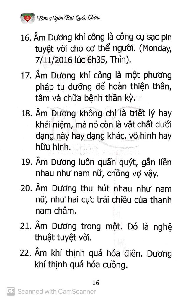 "Sự ra đời của cuốn sách tựa đề là tâm ngôn Bùi Quốc Châu. Tôi bắt đầu viết rải rác từ năm tôi 23 tuổi và cho đến tận hôm nay tôi gần 78 tuổi sách mới được xuất bản và chính thức ra mắt vào ngày 25/12/2018. Tập 1 gồm 2000 câu.