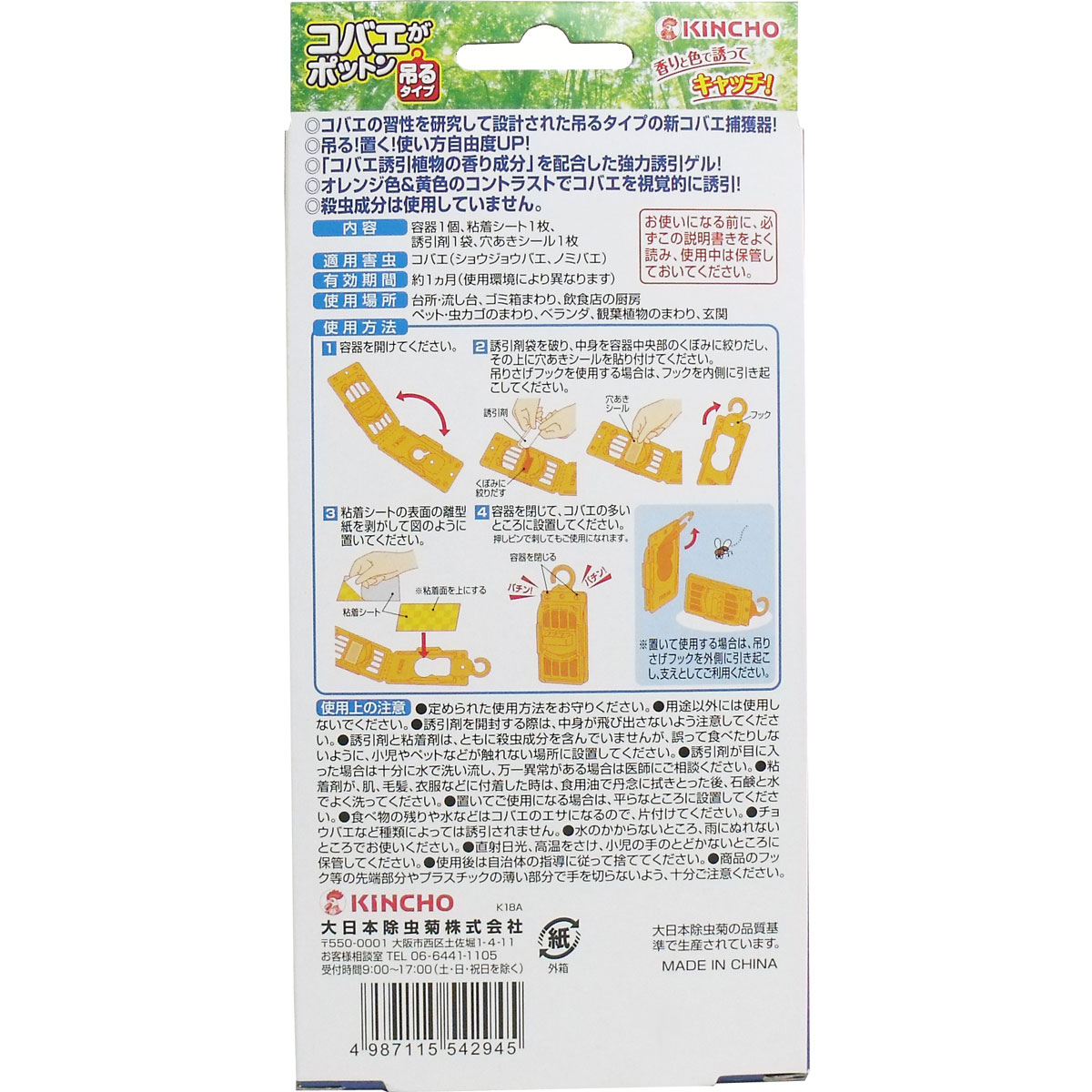- Bóc bỏ lớp giấy ở bề mặt tấm dính và đặt tấm dính vào khung treo. 4: Đóng khung treo và treo hoặc đặt ở nơi cần bẫy ruồi (bồn rửa, nhà bếp, quanh thùng rác, cửa ra vào,). Tham khảo thêm hình ảnh minh họa hướng dẫn sử dụng ở mặt sau hộp giấy. LƯU Ý: Không sử dụng sản phẩm cho mục đích khác. Nếu chất dẫn dụ dính vào mắt, hãy rửa sạch bằng nước. Nếu keo dính dính vào da, tóc, quần áo, hãy lau sạch bằng dầu ăn, sau đó rửa sạch bằng xà phòng và nước. Vui lòng sử dụng sản phẩm ở nơi không tiếp xúc với nước hoặc mưa. BẢO QUẢN Bảo quản nơi khô ráo, thoáng mát. Tránh tiếp xúc ánh sáng trực tiếp hoặc nhiệt độ cao. Để xa tầm tay trẻ em. NHÀ SẢN XUẤT DAINIHON JOCHUGIKU Co.,Ltd. 1-4-11, Tosabori, Nishi-ku, Osaka 550-0001, Japan.