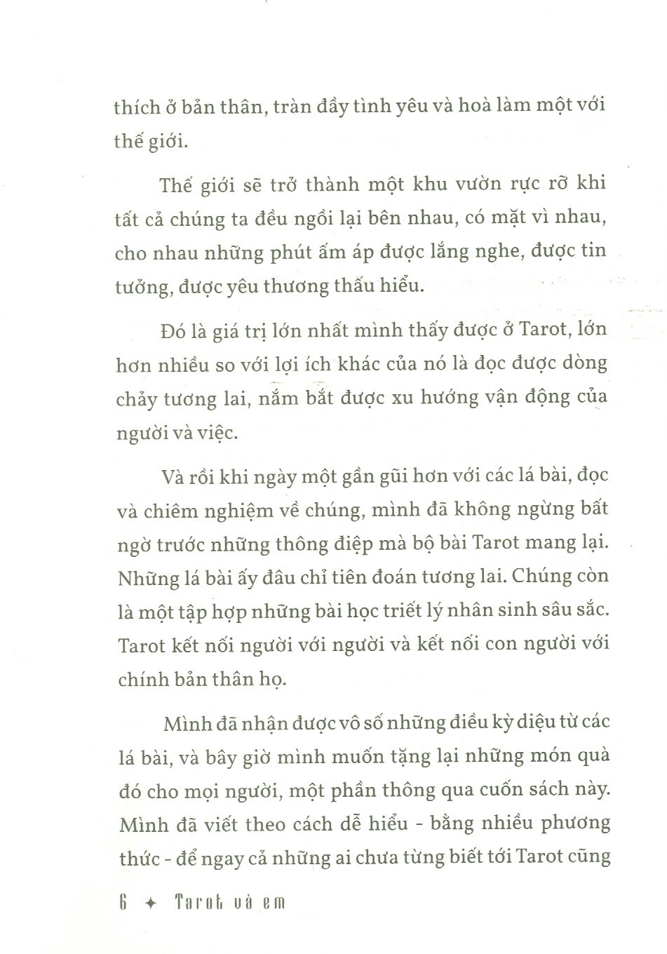 Trong Tarot và em, những lá bài Tarot trở nên sống động như những người bạn ta gặp gỡ trong cuộc sống. Mỗi lá có câu chuyện riêng, chúng không chỉ là điềm báo tương lai mà còn là một tập hợp những triết lý nhân sinh sâu sắc.