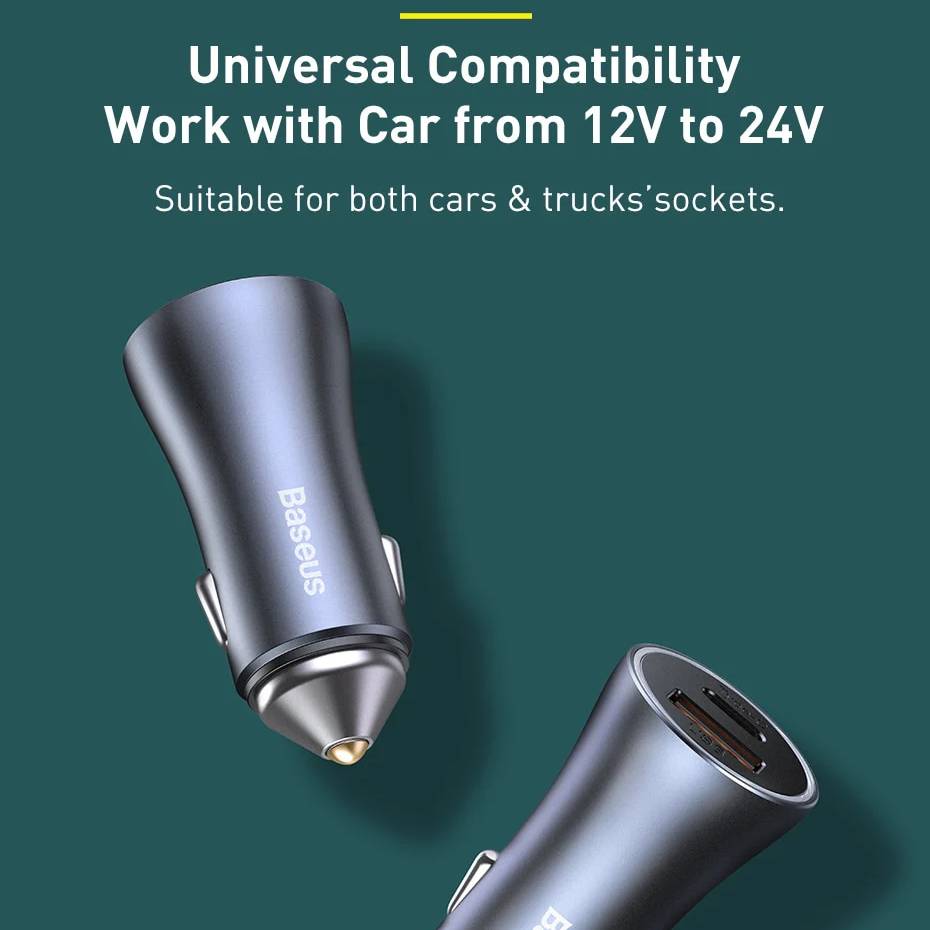 Tẩu củ sạc type c sạc nhanh 40W đa năng cho xe hơi / xe ô tô trang bị cổng Type-C PD và USB hiệu Baseus Goldern Contactor Pro Thiết kế gọn nhẹ và dễ dáng mang theo, chúng sẽ không chiếm nhiều không gian trên xe của bạn. Phù hợp các dòng xe 12V - 24V.