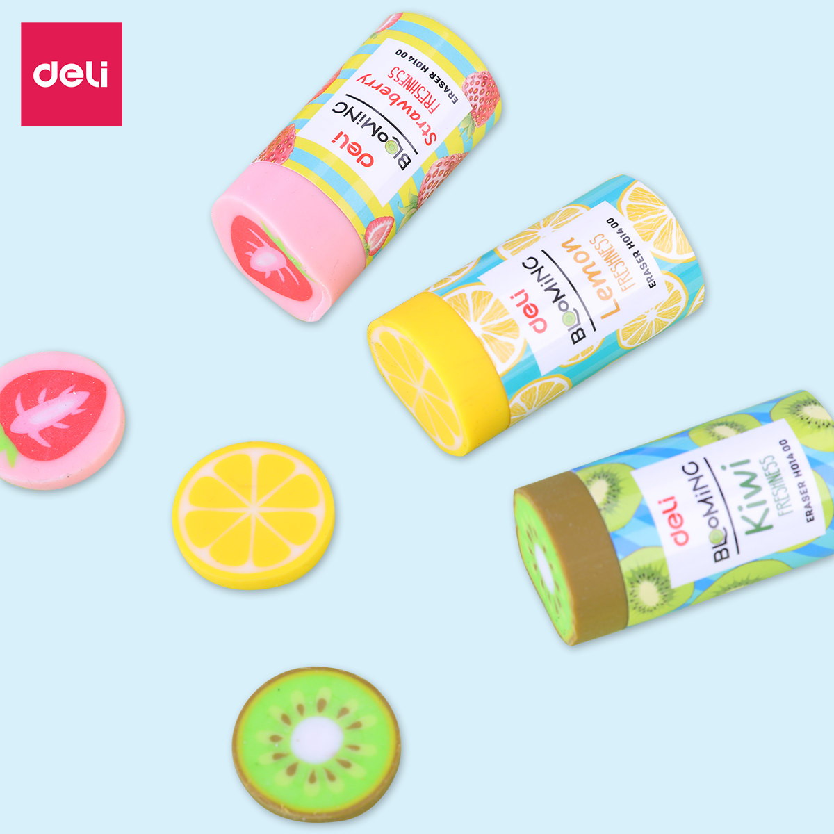 Set 3 gôm tẩy hoa quả Deli 01400 Bộ sản phẩm bao gồm: - Gôm tẩy hoa quả Deli 01400 với 3 loại trái cây phổ biến: Kiwi, Dâu, Chanh cam Deli H01400 / EH01400.