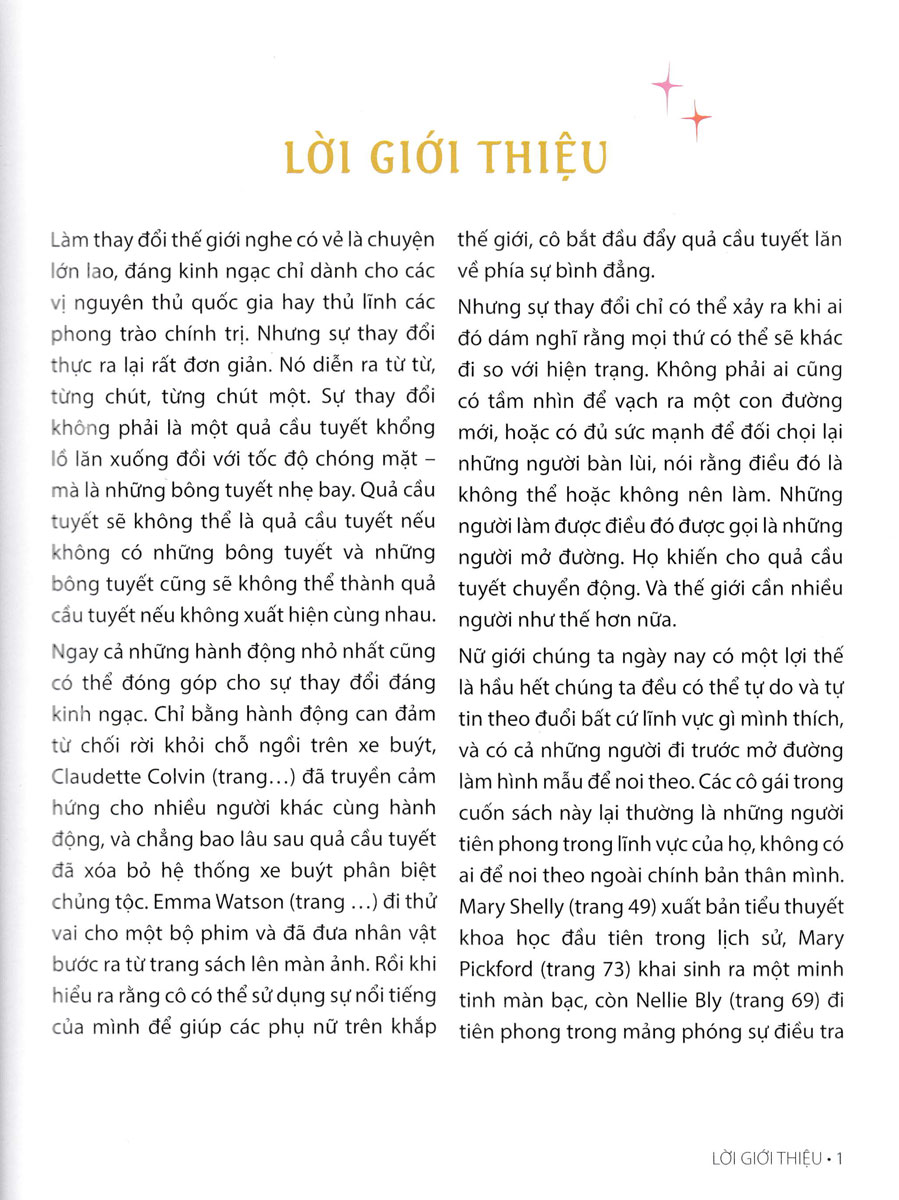 Teen Trailblazers - 30 Cô Gái Can Đảm Làm Thay Đổi Thế Giới Trước Tuổi 20 NỘI DUNG TÁC PHẨM: Làm thay đổi thế giới nghe có vẻ là chuyện lớn lao, đáng kinh ngạc và chỉ dành cho các vị lãnh đạo của các quốc gia hay thủ lĩnh của các phong trào chính trị. Nhưng sự thay đổi thực ra lại đơn giản. Nó diễn ra từ từ, từng chút, từng chút một. Sự thay đổi không phải là một quả cầu tuyết khổng lồ lăn xuống đồi với tốc độ chóng mặt – nó là những bông tuyết nhẹ bay trên núi. Qủa cầu tuyết chẳng là gì nếu không có những bông tuyết và những bông tuyết chẳng là gì nếu không xuất hiện cùng nhau. Ngay cả những hành động nhỏ nhất cũng có thể đóng góp cho sự thay đổi đáng kinh ngạc. Claudette Colvin từ chối rời khỏi chỗ ngồi trên xe buýt. Hành động can đảm của cô đã truyền cảm hứng cho nhiều người khác hành động, và chẳng bao lâu sau quả cầu tuyết đã lăn tới chỗ xóa bỏ hệ thống xe buýt phân biệt ch.ủng tộc. Emma Watson đi thử vai cho một bộ phim và mang đến cho cuộc đời một nhân vật được yêu thích trong một cuốn sách. Sau đó cô hiểu ra rằng cô có thể sử dụng sự nổi tiếng của mình để giúp các phụ nữ trên khắp thế giới, và quả cầu tuyết bắt đầu lăn về phía sự bình đẳng. Nhưng sự thay đổi chỉ có thể xảy ra khi ai đó tưởng tượng rằng mọi chuyện có thể sẽ khác đi. Không phải ai cũng có tầm nhìn để vạch ra một con đường mới, hoặc có đủ sức mạnh để đối chọi lại những người bàn lùi, nói rằng điều đó là không thể hoặc không nên làm. Những người làm được điều đó được gọi là những người mở đường. Họ khiến cho quả cầu tuyết chuyển động. Và thế giới cần nhiều người như thế hơn nữa. Ngày nay chúng ta may mắn: hầu hết phụ nữ có được sự tự do và sự tự tin để đi theo bất cứ hướng nào mình thích. Chúng ta cũng có những người đi trước làm hình mẫu. Họ đã mở đường cho chúng ta. Nhưng các cô gái trong cuốn sách này thường là những người tiên phong trong lĩnh vực của họ, không có ai để noi theo ngoài chính bản thân mình. Mary Shelly xuất bản tiểu thuyết khoa học đầu tiên trong lịch sử, Mary Pickford tạo ra một ngôi sao điện ảnh, còn Nellie Bly đi tiên phong trong mảng phóng sự điều tra – tất cả đều sống trong kỷ nguyên mà phụ nữ được bảo phải ngồi yên và không được lên tiếng. Xã hội không kỳ vọng nhiều ở những cô gái này, vậy nên họ phải kỳ vọng nhiều hơn từ chính bản thân mình. Mặc dù chúng ta đã đi được một chặng đường dài, vẫn cần có sự tiến tới và và vẫn có những con đường cho những nhà tiên phong tuổi “teen” mới dấn bước. Những người phụ nữ trẻ phi thường trong cuốn sách này khác nhau ở mọi khía cạnh – nơi sinh sống, thời gian sống, địa vị xã hội. Một số người có được lợi thế từ sự ủng hộ của cha mẹ, hoặc có tài năng thiên bẩm. Những người khác đơn giản chỉ tin vào điều lớn lao hơn bản thân họ. Một số người khởi đầu với mục đích thay đổi thế giới, những người khác ngẫu nhiên làm được điều đó. Nhưng tất cả họ đều thông minh, sáng tạo, kiên cường, dũng cảm, tràn trề hy vọng, và sự tử tế. Ai trong số họ cũng phải vượt qua những trở ngại như đói nghèo, sự phân biệt giới tính, sự phân biệt ch.ủng tộc, chiến tranh, và sự ám ảnh không thể tránh khỏi của cảm giác sợ hãi. Những người mở đường tuổi teen này là bằng chứng cho thấy bất cứ ai và tất cả mọi người chúng ta đều có thể làm thay đổi thế giới. Những câu chuyện được kể trong cuốn sách này mới chỉ là sự mở đầu. THÔNG TIN TÁC GIẢ: Jennifer Calvert là một nhà văn và biên tập viên của hàng chục cuốn sách phi hư cấu đã được xuất bản. Khi bà không làm nổi bật những thành tựu của những người phụ nữ trẻ phi thường, bạn có thể thấy bà ngồi thu mình với một cuốn sách và một chú mèo ở New Jersey, nước Mỹ. Vessna Asanovic là người vẽ tranh minh họa sống ở Toronto, Canada. Cô lấy bằng cử nhân thiết kế từ Trường Mỹ thuật và Thiết kế Ontario. Cô chủ yếu làm về kỹ thuật số với mối quan tâm đặc biệt với những màu sắc tươi sáng, táo bạo và hình họa. Vào lúc rảnh rỗi, bạn có thể thấy Vasna vẽ lên tập phác thảo của cô dưới một mái hiên đầy nắng.