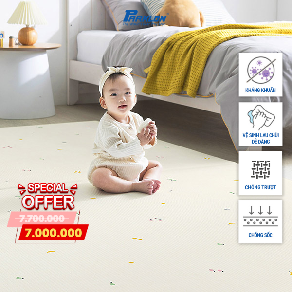 Mua tại TiktokThảm Trẻ Em Hàng Đầu Thế Giới Nhập Khẩu Chính Hãng Hàn Quốc Parklon Thương hiệu: Parklon Xuất xứ: Hàn Quốc Chất liệu: Nhựa PVC Họa tiết: Trái cây cao cấp Kích thước: 210cm x 140cm x 1.5cm Độ bền: 10 năm THẢM TRẺ EM HÀNG ĐẦU THẾ GIỚI CHÍNH HÃNG PARKLON: Bảo vệ con bạn khỏi sàn nhà cứng khi các bé tập bò, tập đứng hay tập đi. Thảm trẻ em Parklon được thiết kế đặc biệt để hấp thụ tác động và mang lại sự thoải mái hàng giờ cho các bé. ★ Chất liệu cao cấp được nhập khẩu từ Đức, kết hợp với công nghệ tiên tiến nhất của Parklon để tạo nên những chiếc thảm trẻ em hoàn hảo nhất. ★ Công nghệ chống sốc, chống va đập và giảm tiếng ồn được cải tiến giúp trẻ thoải mái vui chơi. ★ Thiết kế 2 mặt với hoa văn đặc biệt chống trơn trượt và công nghệ bo góc đặc biệt không gây nguy hiểm cho bé. ★ Công nghệ Nano kháng khuẩn quanh năm, không gây dị ứng, an toàn ngay cả với làn da của trẻ sơ sinh. ★ Khả năng chống nước 100% và dễ dàng vệ sinh, chỉ cần lau sạch vết bẩn bằng khăn. ★ Bề mặt thảm mềm mại, êm ái kết hợp cùng chất liệu đặc biệt giúp giữ ấm vào mùa đông, không nóng vào mùa hè. ★ Chất liệu thân thiện với môi trường, không chứa các chất độc hại và kim loại nặng. ★ Đạt chứng nhận an toàn từ tổ chức toàn cầu: KC, SGS, ISO 9001, An toàn Châu Âu EN71