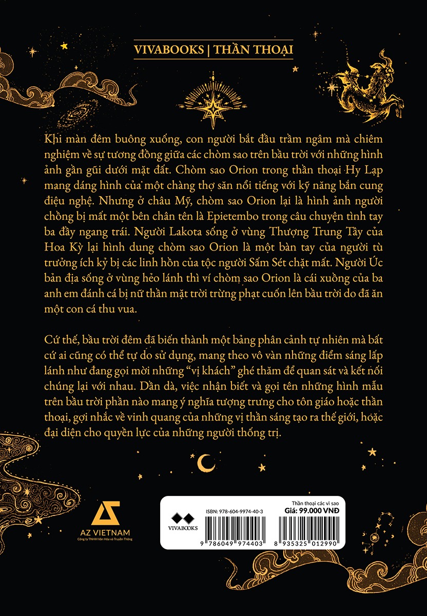 “THẦN THOẠI CÁC VÌ SAO” là bản thu nhỏ của những tinh hoa được đúc kết từ ngàn đời, tập trung vào sự đa dạng văn hóa vốn có trong truyện kể vũ trụ. Là một trong những người đặt nền móng cho nghiên cứu về thiên văn học lịch sử của các nền văn hóa Trung Mỹ thời tiền Colombia, Giáo sư Anthony Aveni đã đưa ra những vấn đề đạo đức và các quy tắc xã hội, về thế giới hiện thực và tinh thần, về các nhu cầu thiết yếu ngay trước mắt cũng như những giấc mơ hoang dại nhất của con người thông qua hình ảnh bầu trời, cùng với đó tôn vinh trí tưởng tượng vô bến bờ của nhân loại thông qua hình mẫu các vì sao.