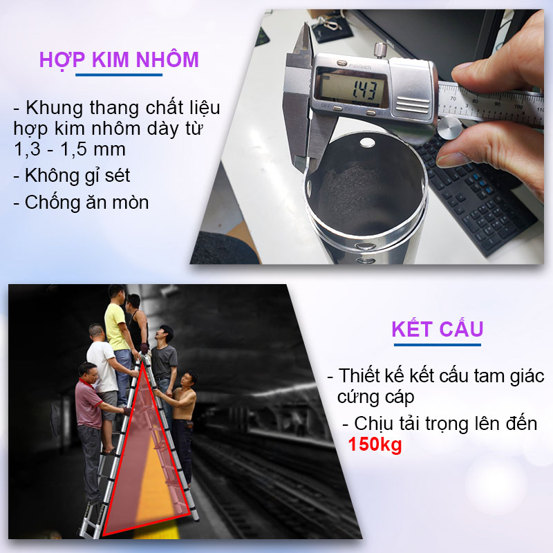 THÔNG SỐ KỸ THUẬT - Kích thước: 87x48x9 cm - Chiều cao tối đa: 3.8m - Chiều cao rút gọn: 0.81m - Số bậc: 13 bậc - Chất liệu: Hợp kim nhôm - Độ dày