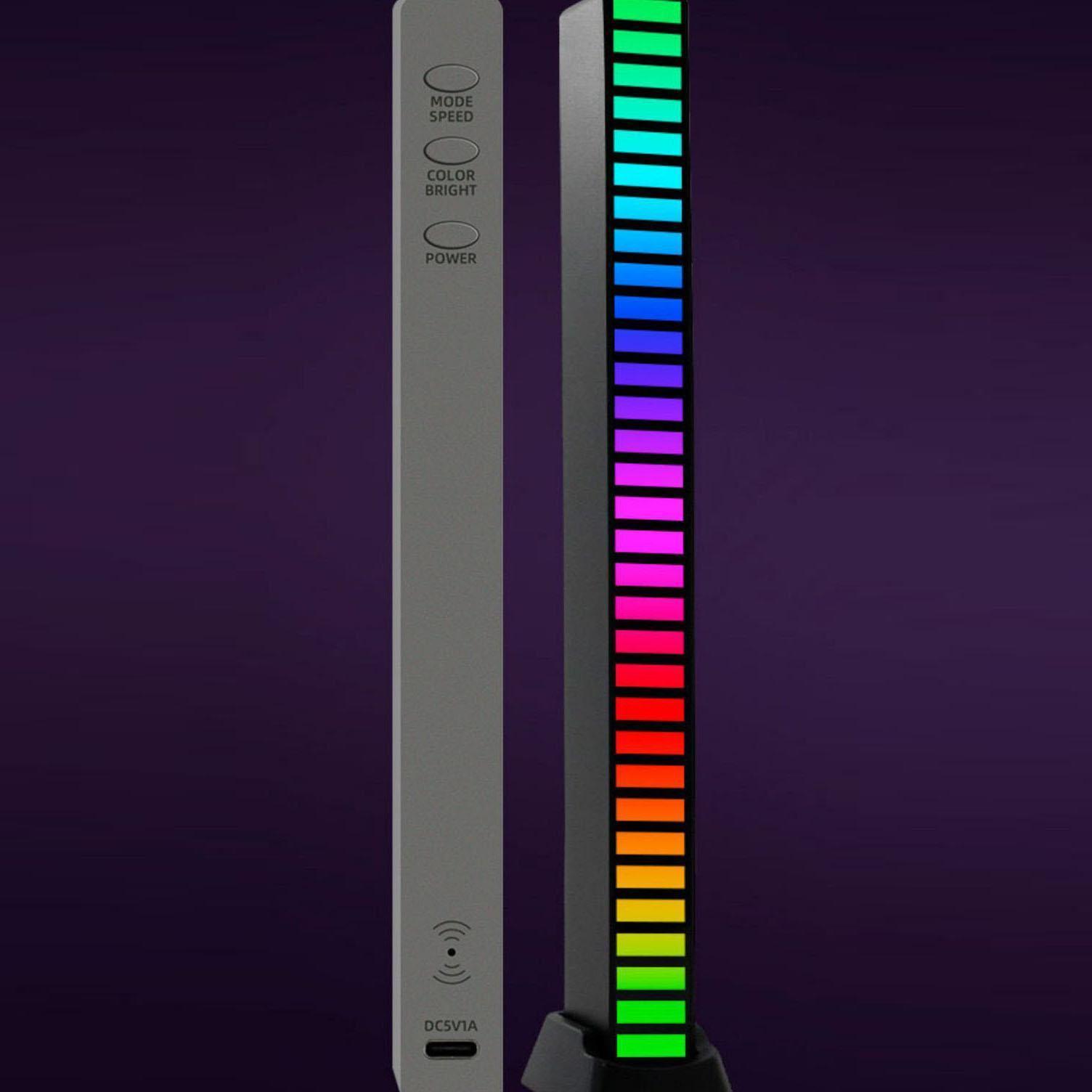 Thanh đèn led RGB cảm ứng âm thanh được trang bị 32 mô-đun đèn led nhiều màu sắc, micrô có độ nhạy cao và bộ xử lý ARM 32-bit với tần số chính là 72M. Nó có 8 chế độ hiển thị, 18 chế độ màu, 4 mức độ sáng và 5 mức tốc độ.