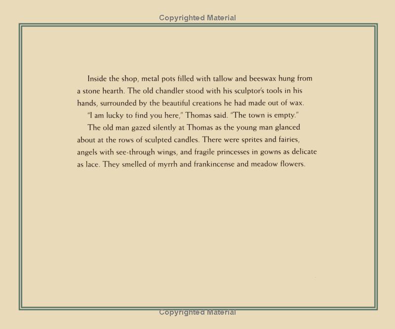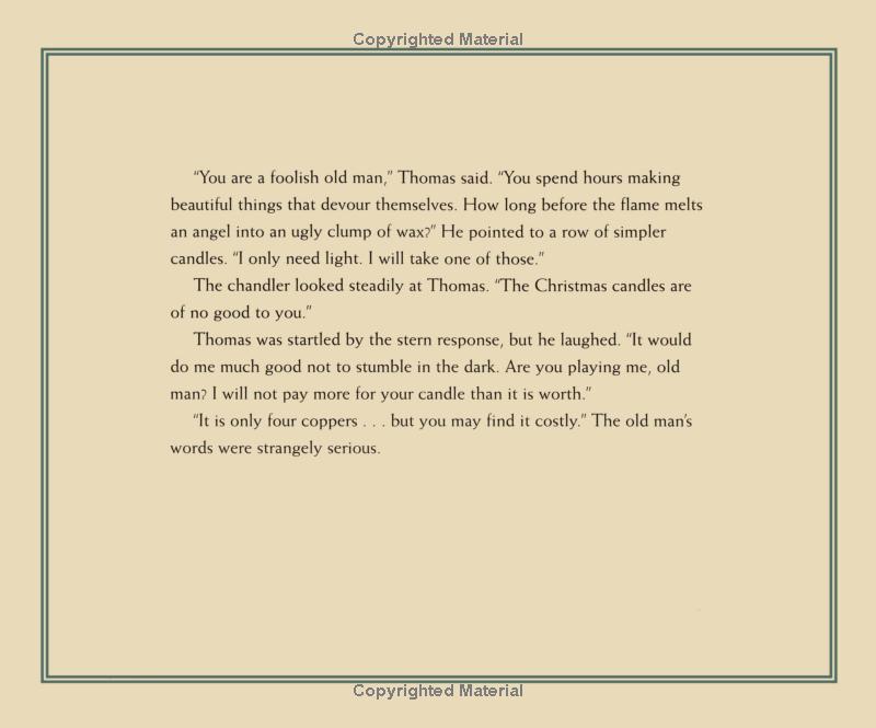 On a snowy Christmas Eve, a young man named Thomas on his way home for a family celebration realizes that the candle in his lantern is about to expire. He stops in a chandler's shop filled with fantastic wax creations, but instead of admiring them Thomas scorns the chandler for wasting his time on sculptures that will only melt. The mysterious old chandler sells him a special Christmas candle. Back on the bitterly cold street, the young man is accosted by an old beggar woman. When he lifts his lantern to get a better look, the candlelight reveals that she is his mother. He gives her his cloak and only then sees the truth: She is not his mother after all, but a stranger. The candle tricks him again before he reaches home, cold and penniless, but richer for his newfound realization that we are all part of one family.