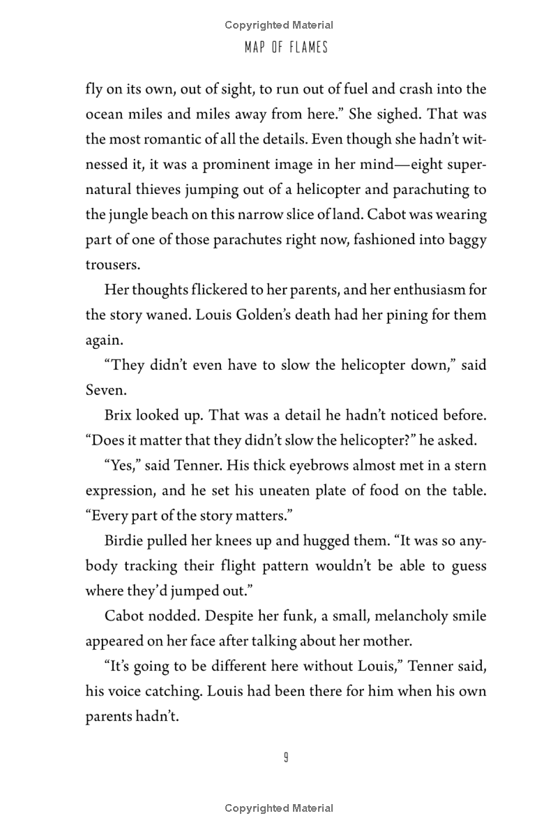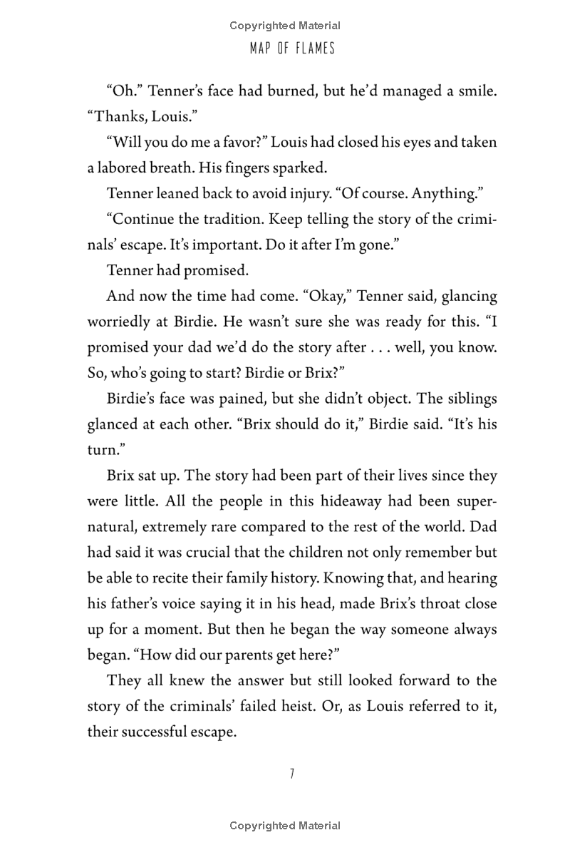 Left behind to fend for themselves are the criminals’ five children, each with superpowers of their own: Birdie can communicate with animals. Brix has athletic abilities and can heal quickly. Tenner can swim like a fish and can see in the dark and hear from a distance. Seven’s skin camouflages to match whatever is around him. Cabot hasn’t shown signs of any unusual power—yet.