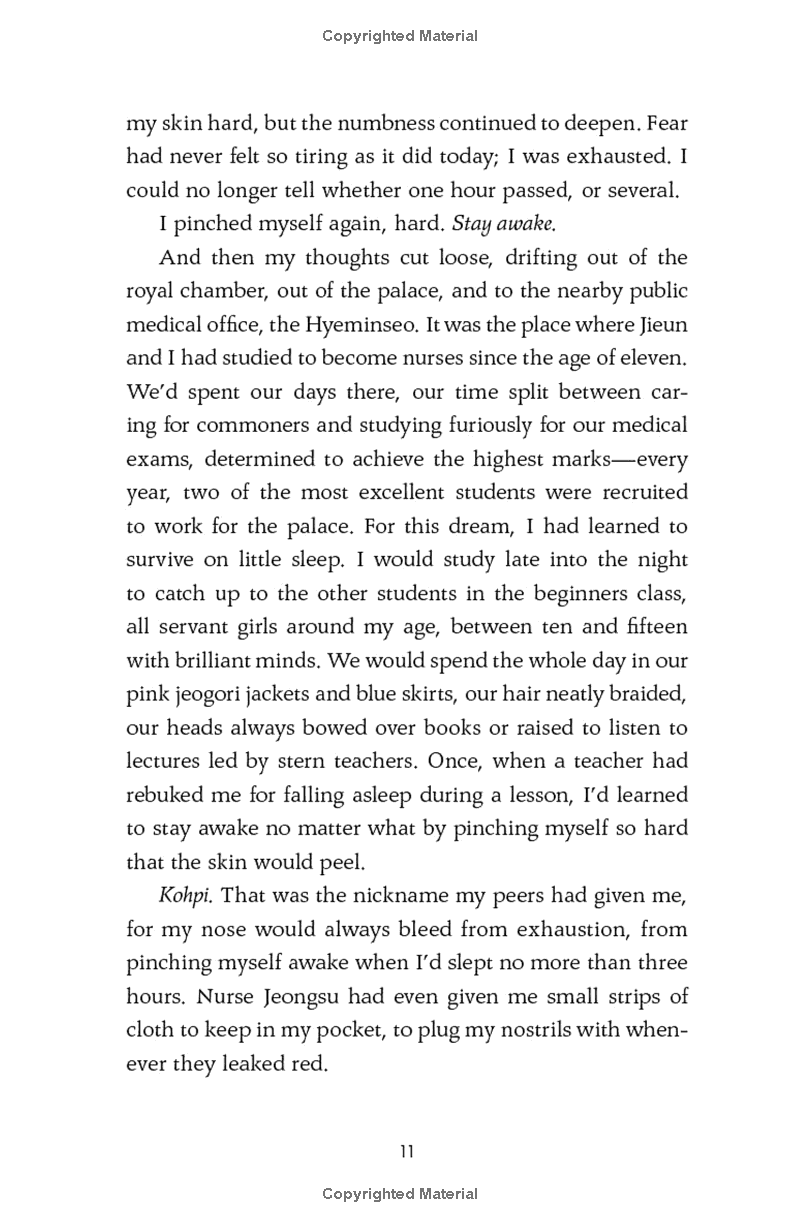 Joseon (Korea), 1758. There are few options available to illegitimate daughters in the capital city, but through hard work and study, eighteen-year-old Hyeon has earned a position as a palace nurse. All she wants is to keep her head down, do a good job, and perhaps finally win her estranged father's approval.