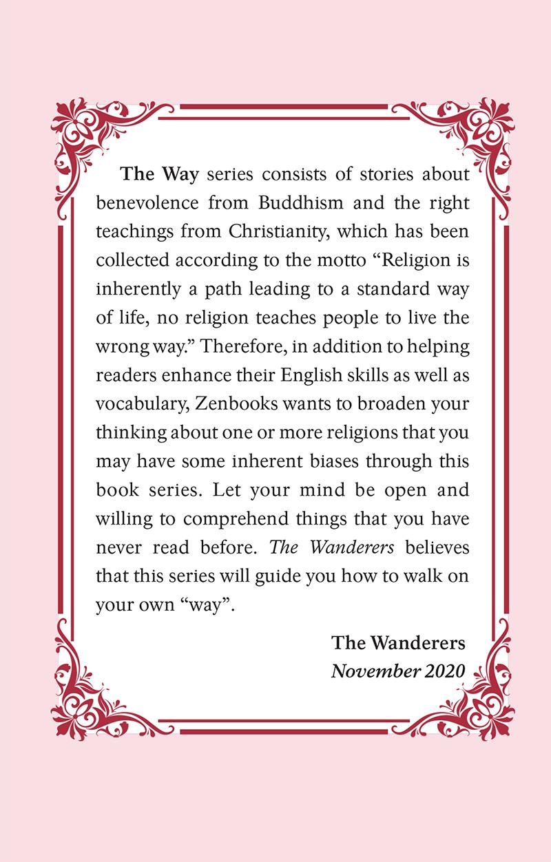 The Way series consists of stories about benevolence from Buddhism and the right teachings from Christianity, which has been collected according to the motto “Religion is inherently a path leading to a standard way of life, no religion teaches people to live the wrong way.” Therefore, in addition to helping readers enhance their English skills as well as vocabulary, Zenbooks wants to broaden your thinking about one or more religions that you may have some inherent biases through this book series. Let your mind be open and willing to comprehend things that you have never read before. The Wanderers believes that this series will guide you how to walk on your own “way”.